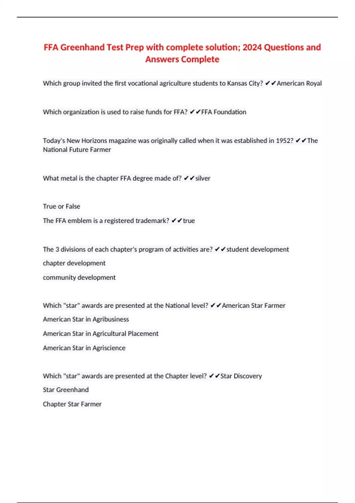 FFA Greenhand Test Prep with complete solution; 2024 Questions and Answers Complete Which group invited the first vocational agriculture students to Kansas City? American Royal Which organization is used to raise funds for FFA? FFA Foundation
