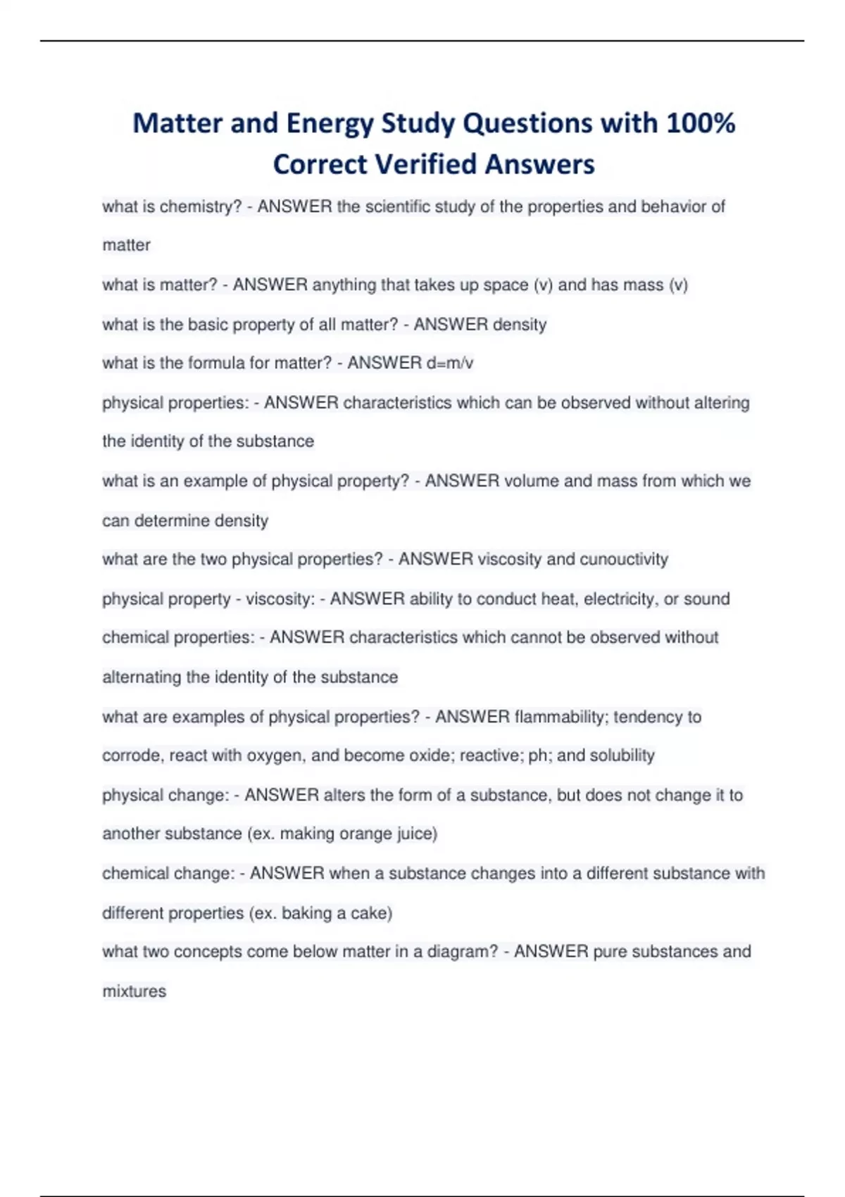 what is chemistry? - ANSWER the scientific study of the properties and behavior of matter what is matter? - ANSWER anything that takes up space (v) and has mass (v) what is the basic property of all matter? - ANSWER density what is the formula for matter? - ANSWER d=m/v physical properties: - ANSWER characteristics which can be observed without altering the identity of the substance