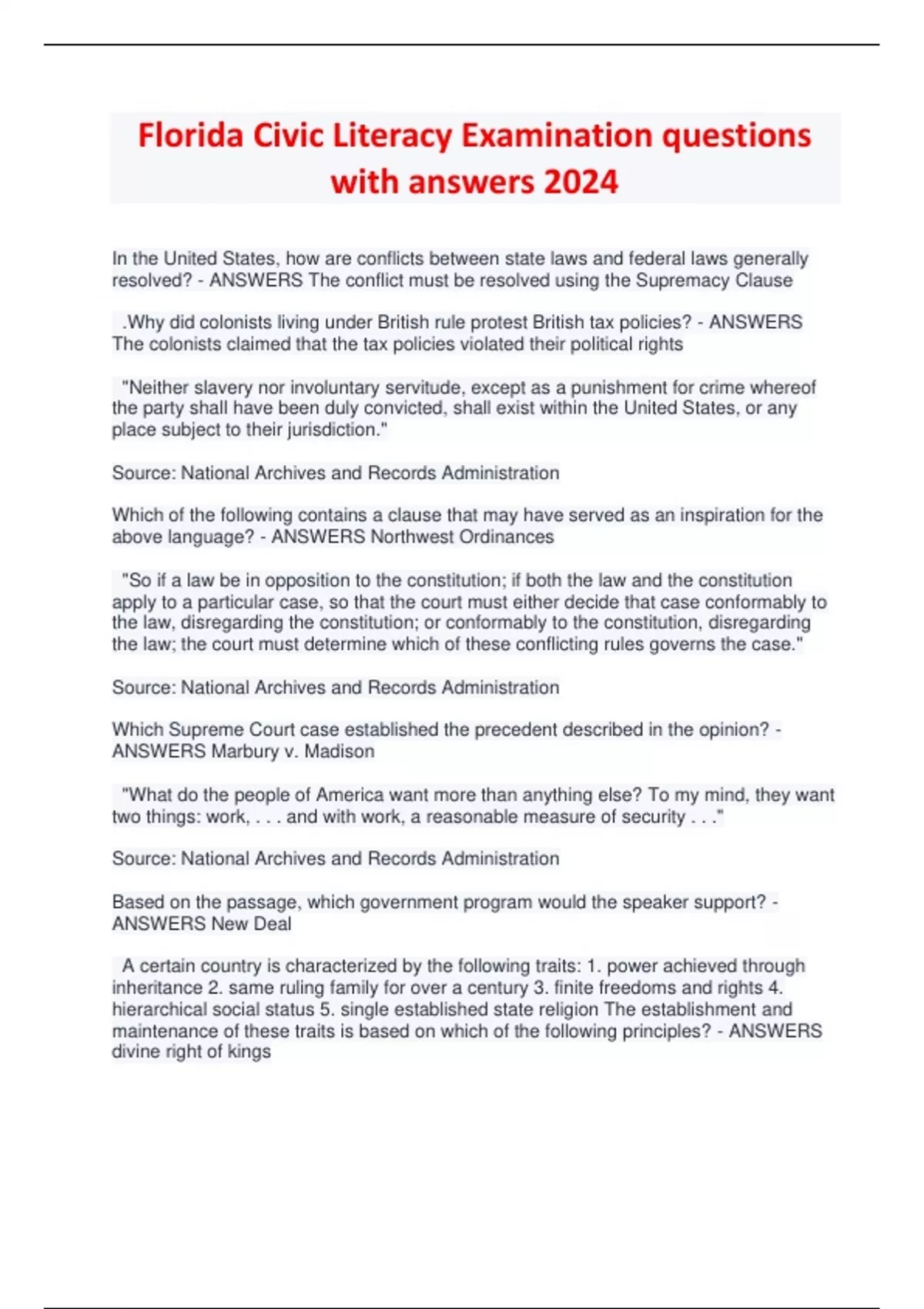 Florida Civic Literacy Examination questions with answers 2024 In the United States, how are conflicts between state laws and federal laws generally resolved? - ANSWERS The conflict must be resolved using the Supremacy Clause .Why did colonists living under British rule protest British tax policies? - ANSWERS The colonists claimed that the tax policies violated their political rights "Neither slavery nor involuntary servitude, except as a punishment for crime whereof the party shall have been duly convicted, shall exist within the United States, or any place subject to their jurisdiction." Source: National Archives and Records Administration Which of the following contains a clause that may have served as an inspiration for the above language? - ANSWERS Northwest Ordinances "So if a law be in opposition to the constitution; if both the law and the constitution apply to a particular case, so that the court must either decide that case conformably to the law, disregarding the constitution; or conformably to the constitution, disregarding the law; the court must determine which of these conflicting rules governs the case." Source: National Archives and Records Administration Which Supreme Court case established the precedent described in the opinion? - ANSWERS Marbury v. Madison "What do the people of America want more than anything else? To my mind, they want two things: work, . . . and with work, a reasonable measure of security . . ." Source: National Archives and Records Administration Based on the passage, which government program would the speaker support? - ANSWERS New Deal A certain country is characterized by the following traits: 1. power achieved through inheritance 2. same ruling family for over a century 3. finite freedoms and rights 4. hierarchical social status 5. single established state religion The establishment and maintenance of these traits is based on which of the following principles? - ANSWERS divine right of kings A man is walking down a public street window-shopping. A robbery is reported in that same area. Police officers stop and search the man who is shopping. On what Constitutional grounds could this man contest this search as a violation of his rights? - ANSWERS Fourth Amendment A person is charged with felony breaking and entering. During the court proceedings, the defendant requested an attorney and was denied the right to counsel. Which Supreme Court case overturned the trial court's decision, due to lack of counsel? - ANSWERS Gideon v. Wainwright A suspect is accused of a crime in one state and flees to another state where they are apprehended. The state is very slow in returning the suspect to the state of origin and keeps them imprisoned. Which of the following represents a suitable petition for the suspect in this situation, in regard to their constitutional rights? - ANSWERS petition for a writ of habeas corpus At the Constitutional Convention, there was a major debate between large states and small states about representation in the new Congress. This debate was resolved by the Great Compromise. What was the result of this compromise? - ANSWERS Congress would have two houses, one in which state representation was based on population and one in which all states had equal representation. By what process were eighteen-year-olds fully granted the right to vote? - ANSWERS constitutional amendment During the 6th century B.C.E., the ancient Athenians divided the powers of their government between two assemblies and guaranteed certain political rights to all male citizens. How do these political reforms best illustrate how societies develop? - ANSWERS by limiting government authority Government by the people and the separation of powers are the main principles of which founding document? - ANSWERS U.S. Constitution He has kept among us, in times of peace, Standing Armies without the Consent of our legislatures. Source: National Archives and Records Administration Which constitutional provision was inspired by the above complaint? - ANSWERS The Third Amendment limits the quartering of soldiers to specific circumstances. In order to attract investment and business and reduce expenses, a state legislature proposes passing a law that removes the need for certain federal regulatory features relating to office and factory environments.