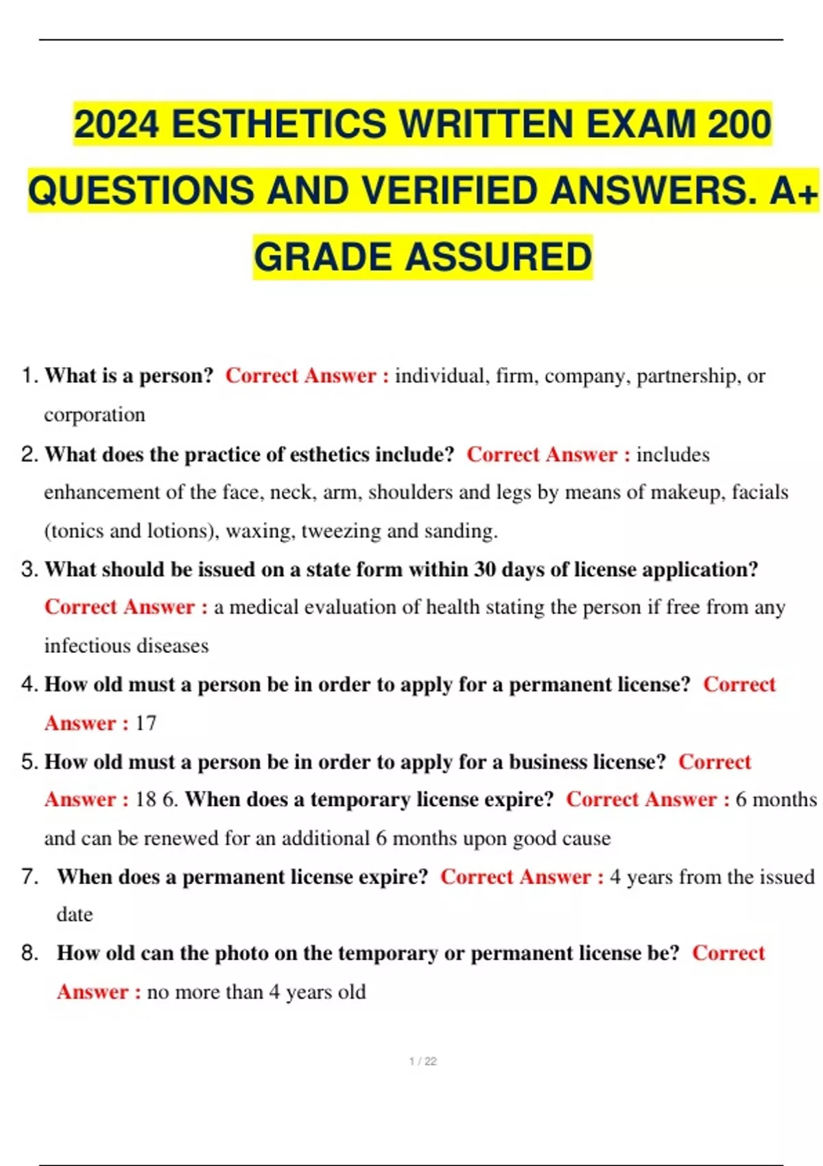 2024 ESTHETICS WRITTEN EXAM 200 QUESTIONS AND VERIFIED ANSWERS. A+ GRADE ASSURED.