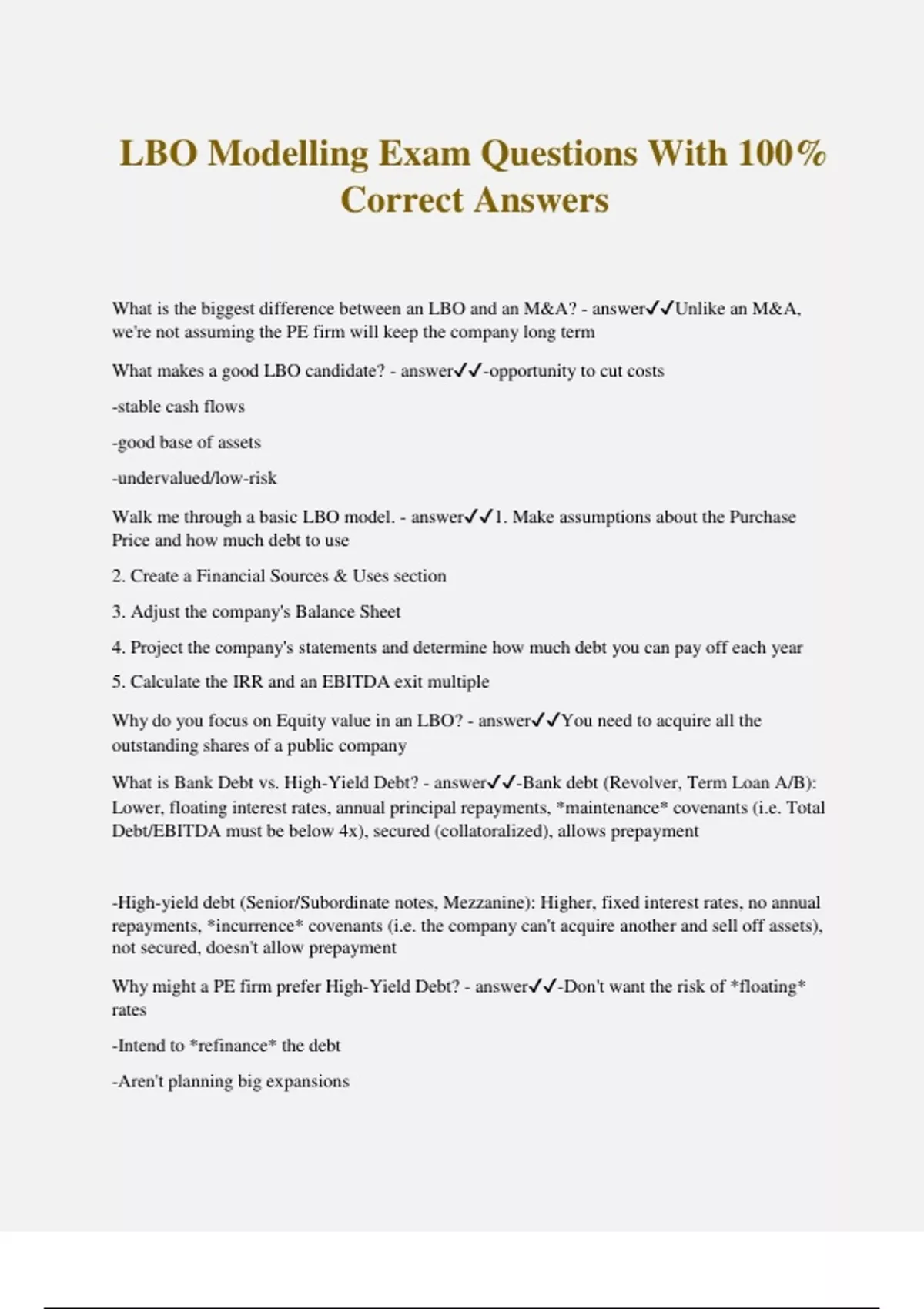LBO Modelling Exam Questions With 100% Correct Answers What is the biggest difference between an LBO and an M&A? - answerUnlike an M&A, we're not assuming the PE firm will keep the company long term What makes a good LBO candidate? - answer-opportunity to cut costs -stable cash flows -good base of assets -undervalued/low-risk Walk me through a basic LBO model. - answer1. Make assumptions about the Purchase Price and how much debt to use 2. Create a Financial Sources & Uses section 3. Adjust the company's Balance Sheet 4. Project the company's statements and determine how much debt you can pay off each year 5. Calculate the IRR and an EBITDA exit multiple Why do you focus on Equity value in an LBO? - answerYou need to acquire all the outstanding shares of a public company What is Bank Debt vs. High-Yield Debt? - answer-Bank debt (Revolver, Term Loan A/B): Lower, floating interest rates, annual principal repayments, *maintenance* covenants (i.e. Total Debt/EBITDA must be below 4x), secured (collatoralized), allows prepayment -High-yield debt (Senior/Subordinate notes, Mezzanine): Higher, fixed interest rates, no annual repayments, *incurrence* covenants (i.e. the company can't acquire another and sell off assets), not secured, doesn't allow prepayment Why might a PE firm prefer High-Yield Debt? - answer-Don't want the risk of *floating* rates -Intend to *refinance* the debt -Aren't planning big expansions -Don't believe their returns are sensitive to interest payments How to assess the amount of debt to use: - answerYou can look at recent, similar LBOs and assess the terms, or you can look at your company's Leverage Ratio or Interest Coverage ratio, to see how much debt it can afford to take on. Leverage Ratio = - answerDebt / EBITDA Interest coverage ratio - answerEBITDA / Interest Expense What are reasonable Leverage and Coverage Ratios? - answerDebt/EBITDA should rarely exceed 10x. For Interest Coverage, you want a number where the company can pay for its interest without trouble, but also not high enough where it can't afford more debt. Why is it better to reduce the amount of cash PE firms pay up front? - answerThe returns go up because reducing the amount of cash you pay up-front for an asset has a disproportionate effect on your returns... since money today is worth more than money tomorrow. Common Uses of Funding - answer-Buyout of oldco's equity -Refinancing of oldco debt -Transaction & Financing fees Common Sources of Funding - answer-Excess cash -Debt (term loans, notes, etc.) -Preferred stock -Management rollover -Sponsor equity Do you pay the Equity Value or Enterprise Value in an LBO? - answer-If you *refinance* existing debt, the price will be closer to the Enterprise Value -if you *assume* the debt, the purchase price will be closer to the Equity value What happens if the PE firm pays off the debt? - answerThe PE firm must *increase* the funds required to buy the company, and the debt goes under the *uses* column (purchase price is closer to the EV) What happens if the PE firm assumes (takes on) the debt? - answerIt has no impact on the total funds it must raise, and it goes on the balance sheet of the PE firm and listed under *both* sources and uses (purchase price closer to the Equity Value)