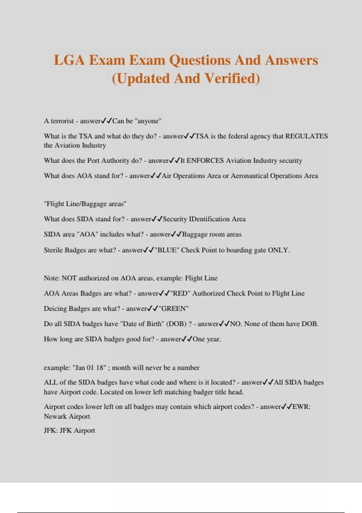 LGA Exam Exam Questions And Answers (Updated And Verified) A terrorist - answerCan be "anyone" What is the TSA and what do they do? - answerTSA is the federal agency that REGULATES the Aviation Industry What does the Port Authority do? - answerIt ENFORCES Aviation Industry security What does AOA stand for? - answerAir Operations Area or Aeronautical Operations Area "Flight Line/Baggage areas" What does SIDA stand for? - answerSecurity IDentification Area SIDA area "AOA" includes what? - answerBaggage room areas Sterile Badges are what? - answer"BLUE" Check Point to boarding gate ONLY. Note: NOT authorized on AOA areas, example: Flight Line AOA Areas Badges are what? - answer"RED" Authorized Check Point to Flight Line Deicing Badges are what? - answer"GREEN" Do all SIDA badges have "Date of Birth" (DOB) ? - answerNO. None of them have DOB. How long are SIDA badges good for? - answerOne year. example: "Jan 01 18" ; month will never be a number ALL of the SIDA badges have what code and where is it located? - answerAll SIDA badges have Airport code. Located on lower left matching badger title head. Airport codes lower left on all badges may contain which airport codes? - answerEWR: Newark Airport JFK: JFK Airport