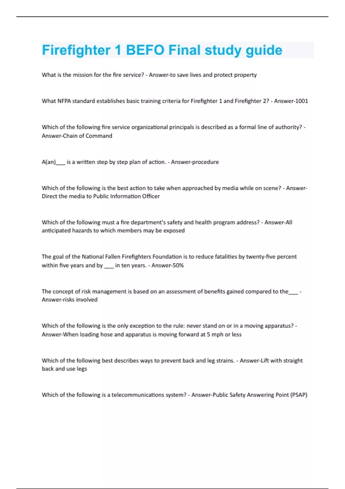 What is the mission for the fire service? - Answer-to save lives and protect property What NFPA standard establishes basic training criteria for Firefighter 1 and Firefighter 2? - Answer-1001 Which of the following fire service organizational principals is described as a formal line of authority? - Answer-Chain of Command A(an)___ is a written step by step plan of action. - Answer-procedure Which of the following is the best action to take when approached by media while on scene? - AnswerDirect the media to Public Information Officer Which of the following must a fire department's safety and health program address? - Answer-All anticipated hazards to which members may be exposed The goal of the National Fallen Firefighters Foundation is to reduce fatalities by twenty-five percent within five years and by ___ in ten years. - Answer-50% The concept of risk management is based on an assessment of benefits gained compared to the___ - Answer-risks involved Which of the following is the only exception to the rule: never stand on or in a moving apparatus? - Answer-When loading hose and apparatus is moving forward at 5 mph or less Which of the following best describes ways to prevent back and leg strains. - Answer-Lift with straight back and use legs Which of the following is a telecommunications system? - Answer-Public Safety Answering Point (PSAP)Which of the following regulates all radio communication in the United States? - Answer-Federal Communications Commission (FCC) Which of the following radio limitations can mean a receiver is near the limit of its transmission range? - Answer-Static and broken messages Units or individuals must ___ in every transmission as outlined in the local radio protocols. - AnswerIdentify themselves Which of the following is a guideline to ensure a message is heard and understood? - Answer-use a moderate rate of speaking Which of the following is the most common building material in North America? - Answer-Wood Steel structural members lengthen as much as 4 inches (100 mm) when heated to: - Answer-1,000F Laminated timber, medium density fiberboard (MDF), and finger-jointed timber are all examples of what common building material? - Answer-Composite Material What building component is designed to support the weight of a building and all its contents? - AnswerFoundation Doors are classified by: - Answer-the way they operate.