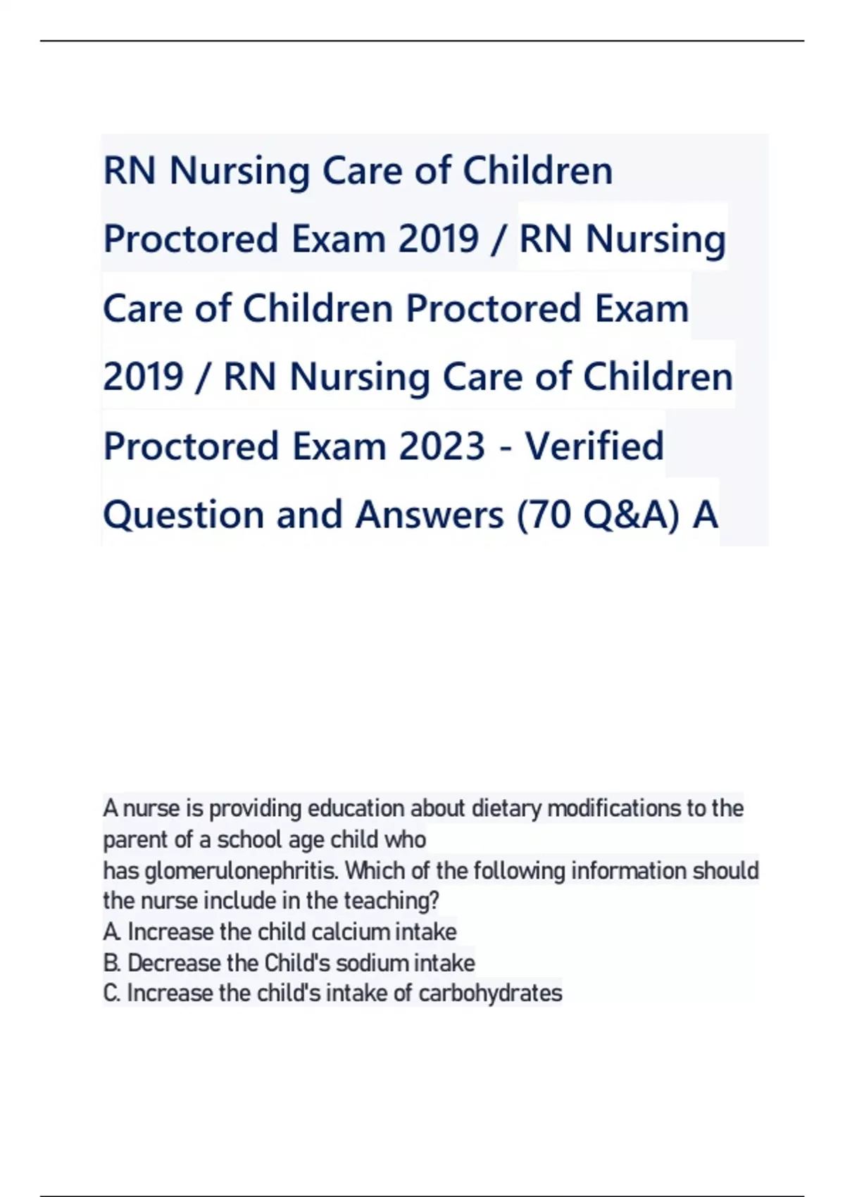 RN Nursing Care of Children Proctored Exam 2019 / RN Nursing Care of Children Proctored Exam 2019 / RN Nursing Care of Children Proctored Exam 2023 - Verified Question and Answers (70 Q&A) A A nurse is providing education about dietary modifications to the parent of a school age child who has glomerulonephritis. Which of the following information should the nurse include in the teaching? A. Increase the child calcium intake B. Decrease the Child's sodium intake C. Increase th