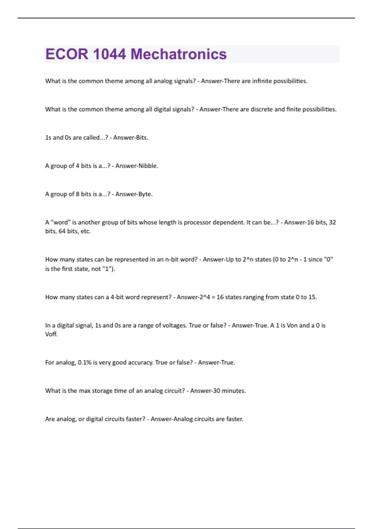 What is the common theme among all analog signals? - Answer-There are infinite possibilities. What is the common theme among all digital signals? - Answer-There are discrete and finite possibilities. 1s and 0s are called...? - Answer-Bits. A group of 4 bits is a...? - Answer-Nibble. A group of 8 bits is a...? - Answer-Byte. A "word" is another group of bits whose length is processor dependent. It can be...? - Answer-16 bits, 32 bits, 64 bits, etc. How many states can be represented in an n-bit word? - Answer-Up to 2^n states (0 to 2^n - 1 since "0" is the first state, not "1"). How many states can a 4-bit word represent? - Answer-2^4 = 16 states ranging from state 0 to 15. In a digital signal, 1s and 0s are a range of voltages. True or false? - Answer-True. A 1 is Von and a 0 is Voff. For analog, 0.1% is very good accuracy. True or false? - Answer-True. What is the max storage time of an analog circuit? - Answer-30 minutes. Are analog, or digital circuits faster? - Answer-Analog circuits are faster.An OR gate in Boolean algebra is represented by a multiplication symbol. True or False? - Answer-False. The plus sign represents an OR gate. In an AND gate, X is equal to 1 when...? - Answer-Both a and b are 1. In an XOR gate, X is equal to 1 when...? - Answer-Exactly one of a or b is 1. In a NAND gate, X is equal to 1 when...? - Answer-Both a and b are 0. In a NOR gate, X is equal to 1 when...? - Answer-a or b or both are 0. To get the dual of an expression, you have to... - Answer-Put brackets around all AND terms, then swap ANDs and ORs and swap 1s and 0s. In an XNOR gate, X is equal to 1 when...? - Answer-Exactly one of a or b is 0. How many rows are in a truth table with 4 input variables? - Answer-16 rows. 4 input variables means a 4-bit number. A 4 bit number has 2^4 states. Each state is a row. Inverting any of the leads (a, b, or X) of an XOR gate changes it into an NAND gate. True or false? - Answer-False. Inverting any of the leads (a, b, or X) of an XOR gate changes it into an XNOR gate. What are 3 applications of XOR gates? - Answer-Controlled inverter, equality check, and odd parity. Inverting the inputs of a gate is equivalent to inverting the output of a gate. True or false? - Answer-False. An expression is equal to its dual. True or false? - Answer-False. What are the 3 steps for converting analog to digital? - Answer-Sampling, quantizing, and encoding.What is sampling? - Answer-Conversion of a continuous signal to a discrete-time signal. What is quantizing? - Answer-Conversion of a discrete-time signal to discrete amplitude signal. What is encoding? - Answer-Conversion of a discrete signal to binary word.