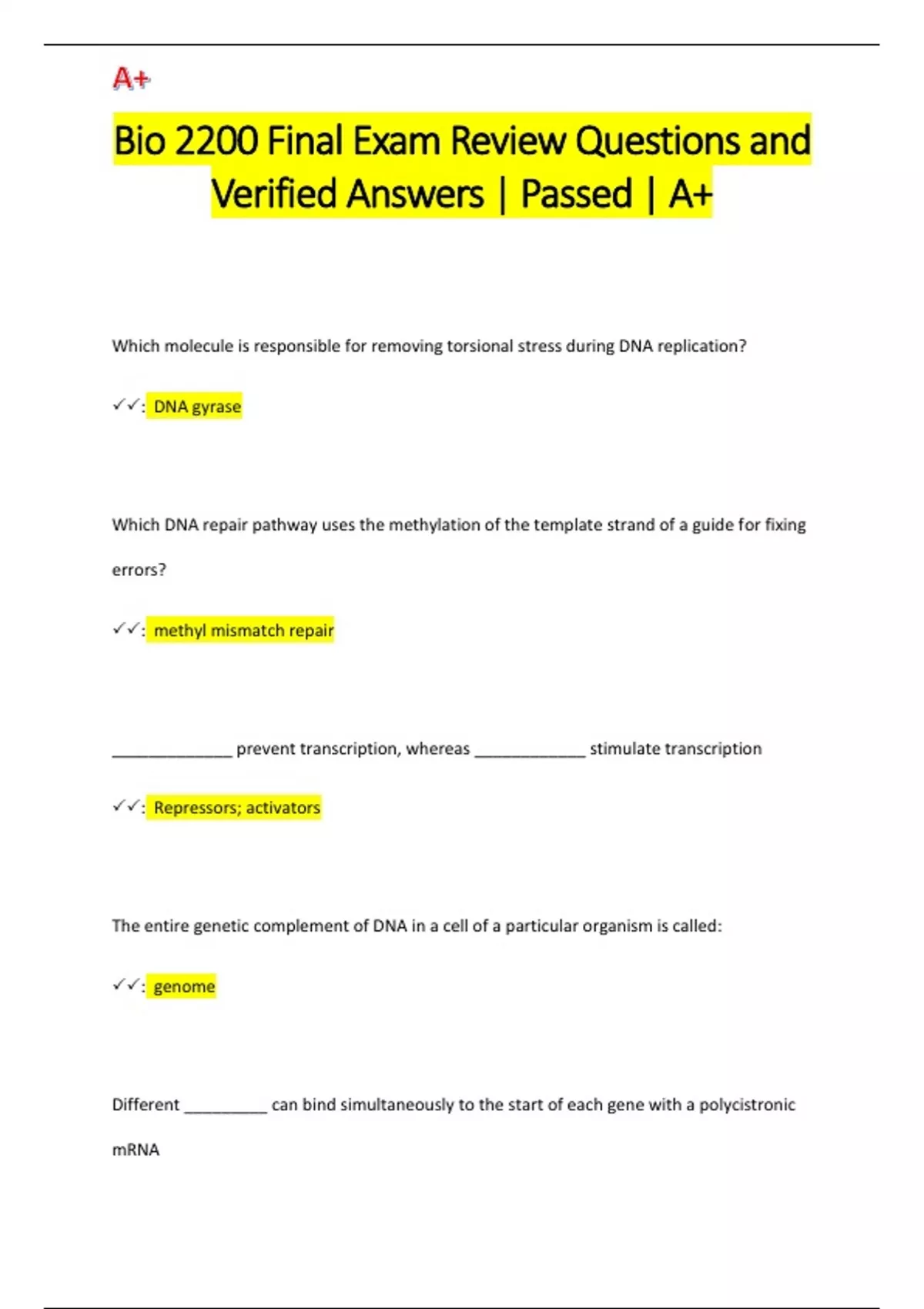 Which molecule is responsible for removing torsional stress during DNA replication? : DNA gyrase Which DNA repair pathway uses the methylation of the template strand of a guide for fixing errors? : methyl mismatch repair _____________ prevent transcription, whereas ____________ stimulate transcription : Repressors; activators The entire genetic complement of DNA in a cell of a particular organism is called: : genome Different _________ can bind simultaneously to the start of each gene with a polycistronic mRN