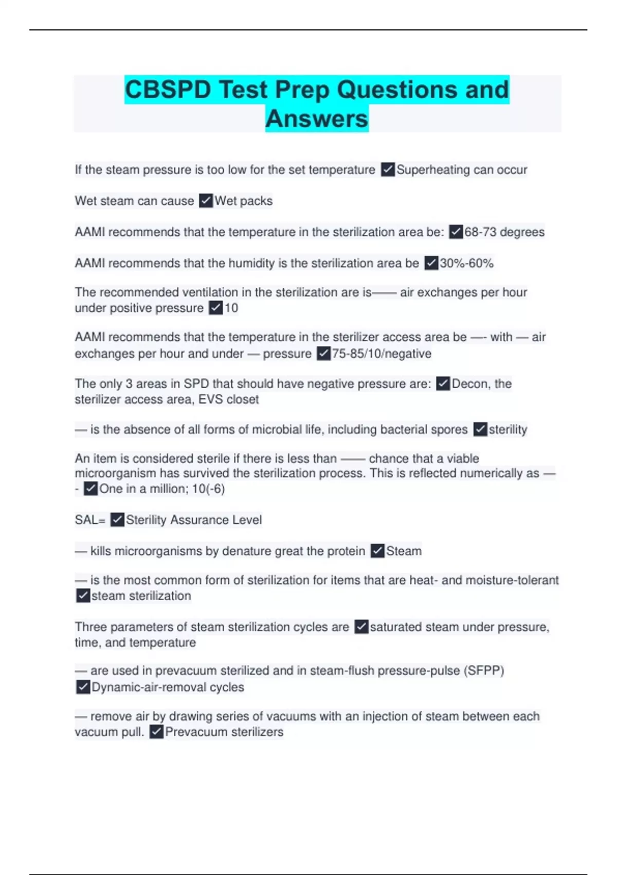 If the steam pressure is too low for the set temperature Superheating can occur Wet steam can cause Wet packs AAMI recommends that the temperature in the sterilization area be: 68-73 degrees AAMI recommends that the humidity is the sterilization area be 30%-60% The recommended ventilation in the sterilization are is—— air exchanges per hour under positive pressure 10 AAMI recommends that the temperature in the sterilizer access area be —- with — air exchanges per hour and under — pressure 75-85/10/negative The only 3 areas in SPD that should have negative pressure are: Decon, the sterilizer access area, EVS closet — is the absence of all forms of microbial life, including bacterial spores sterility An item is considered sterile if there is less than —— chance that a viable microorganism has survived the sterilization process. This is reflected numerically as —- One in a million; 10(-6) SAL= Sterility Assurance Level — kills microorganisms by denature great the protein Steam — is the most common form of sterilization for items that are heat- and moisture-tolerant steam sterilization Three parameters of steam sterilization cycles are saturated steam under pressure, time, and temperature — are used in prevacuum sterilized and in steam-flush pressure-pulse (SFPP) Dynamic-air-removal cycles — remove air by drawing series of vacuums with an injection of steam between each vacuum pull. Prevacuum sterilizers