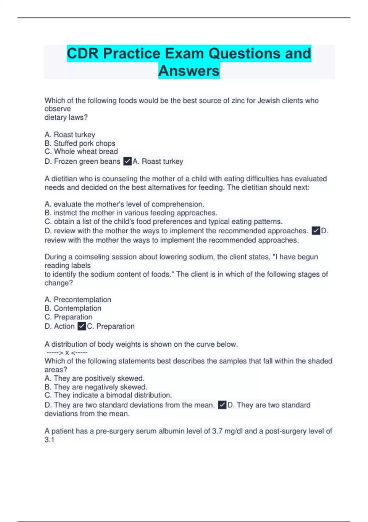 Which of the following foods would be the best source of zinc for Jewish clients who observe dietary laws? A. Roast turkey B. Stuffed pork chops C. Whole wheat bread D. Frozen green beans A. Roast turkey A dietitian who is counseling the mother of a child with eating difficulties has evaluated needs and decided on the best alternatives for feeding. The dietitian should next: A. evaluate the mother's level of comprehension. B. instmct the mother in various feeding approaches. C. obtain a list of the child's food preferences and typical eating patterns. D. review with the mother the ways to implement the recommended approaches. D. review with the mother the ways to implement the recommended approaches. During a coimseling session about lowering sodium, the client states, "I have begun reading labels to identify the sodium content of foods." The client is in which of the following stages of change? A. Precontemplation B. Contemplation C. Preparation D. Action C. Preparation A distribution of body weights is shown on the curve below. ----- x ----- Which of the following statements best describes the samples that fall within the shaded areas? A. They are positively skewed. B. They are negatively skewed. C. They indicate a bimodal distribution. D. They are two standard deviations from the mean. D. They are two standard deviations from the mean. A patient has a pre-surgery serum albumin level of 3.7 mg/dl and a post-surgery level of 3.1