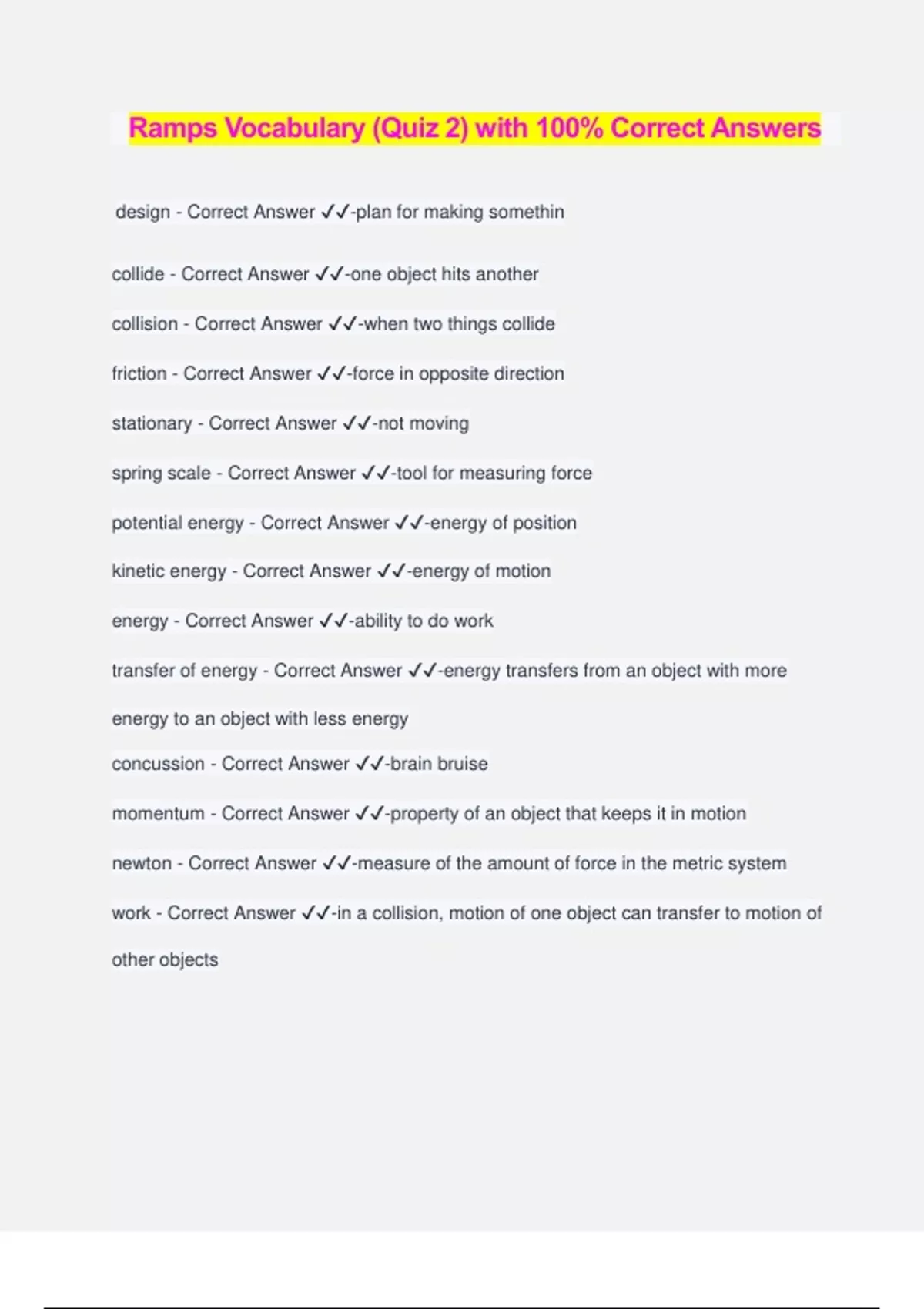 Ramps Vocabulary (Quiz 2) with 100% Correct Answers design - Correct Answer ️️ -plan for making somethin collide - Correct Answer ️️ -one object hits another
