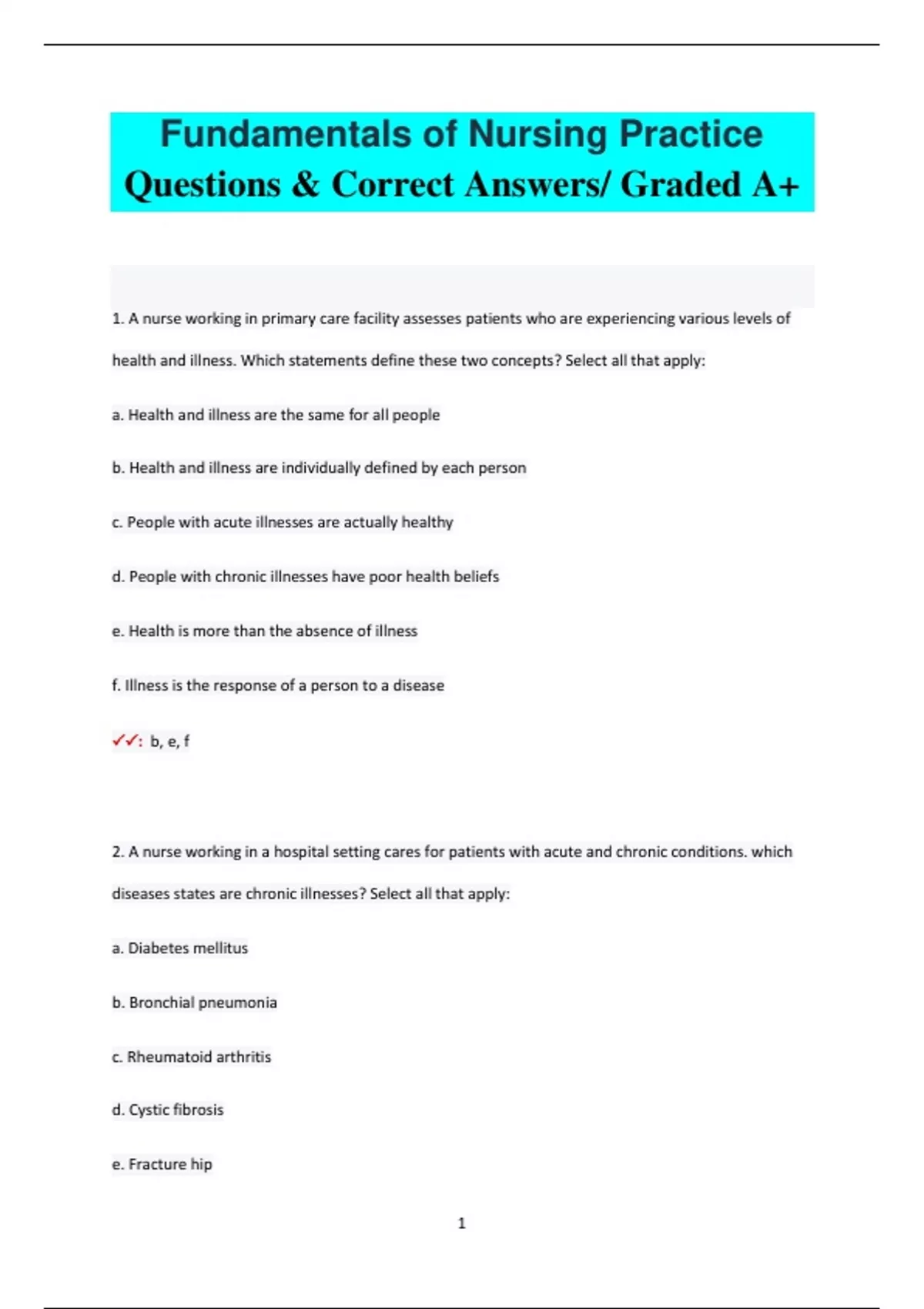 1. A nurse working in primary care facility assesses patients who are experiencing various levels of health and illness. Which statements define these two concepts? Select all that apply: a. Health and illness are the same for all people b. Health and illness are individually defined by each person c. People with acute illnesses are actually healthy d. People with chronic illnesses have poor health beliefs e. Health is more than the absence of illness f. Illness is the response of a person to a disease : b, e, f 2. A nurse working in a hospital setting cares for patients with acute and chronic conditions. which diseases states are chronic illnesses? Select all that apply: a. Diabetes mellitus b. Bronchial pneumonia c. Rheumatoid arthritis d. Cystic fibrosis e. Fracture hip 2 f. Otitis media : a, c, d 3. Despite a national focus on health promotion, nurses working with patients in inner-city continue to see disparities in health care for vulnerable populations. Which patients are considered vulnerable populations? Select all that apply: a. A white male diagnosed with HIV b. An African American teenagers who is 6 months pregnant c. A Hispanic male who has type II diabetes d. A low-income family living in rural America e. A middle-class teacher living in a large city f. A white baby who was born with cerebral pals