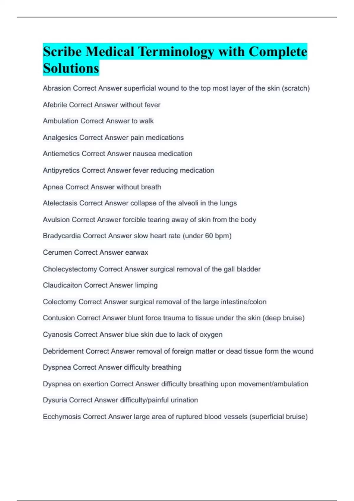 Scribe Medical Terminology with Complete Solutions Abrasion Correct Answer superficial wound to the top most layer of the skin (scratch)