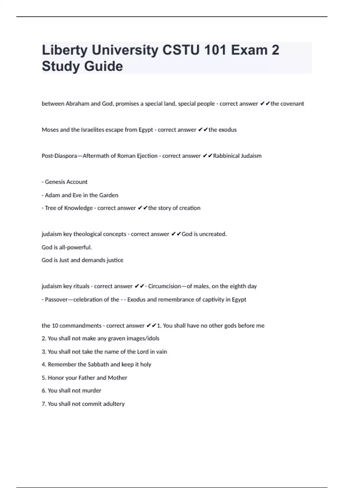 Liberty University CSTU 101 Exam 2 Study Guidebetween Abraham and God, promises a special land, special people - correct answer the covenant Moses and the Israelites escape from Egypt - correct answer the exodus Post-Diaspora—Aftermath of Roman Ejection - correct answer Rabbinical Judaism - Genesis Account - Adam and Eve in the Garden - Tree of Knowledge - correct answer the story of creation judaism key theological concepts - correct answer God is uncreated. God is all-powerful. God is Just and demands justice judaism key rituals - correct answer - Circumcision—of males, on the eighth day - Passover—celebration of the - - Exodus and remembrance of captivity in Egypt the 10 commandments - correct answer 1. You shall have no other gods before me 2. You shall not make any graven images/idols 3. You shall not take the name of the Lord in vain 4. Remember the Sabbath and keep it holy 5. Honor your Father and Mother 6. You shall not murder 7. You shall not commit adultery
