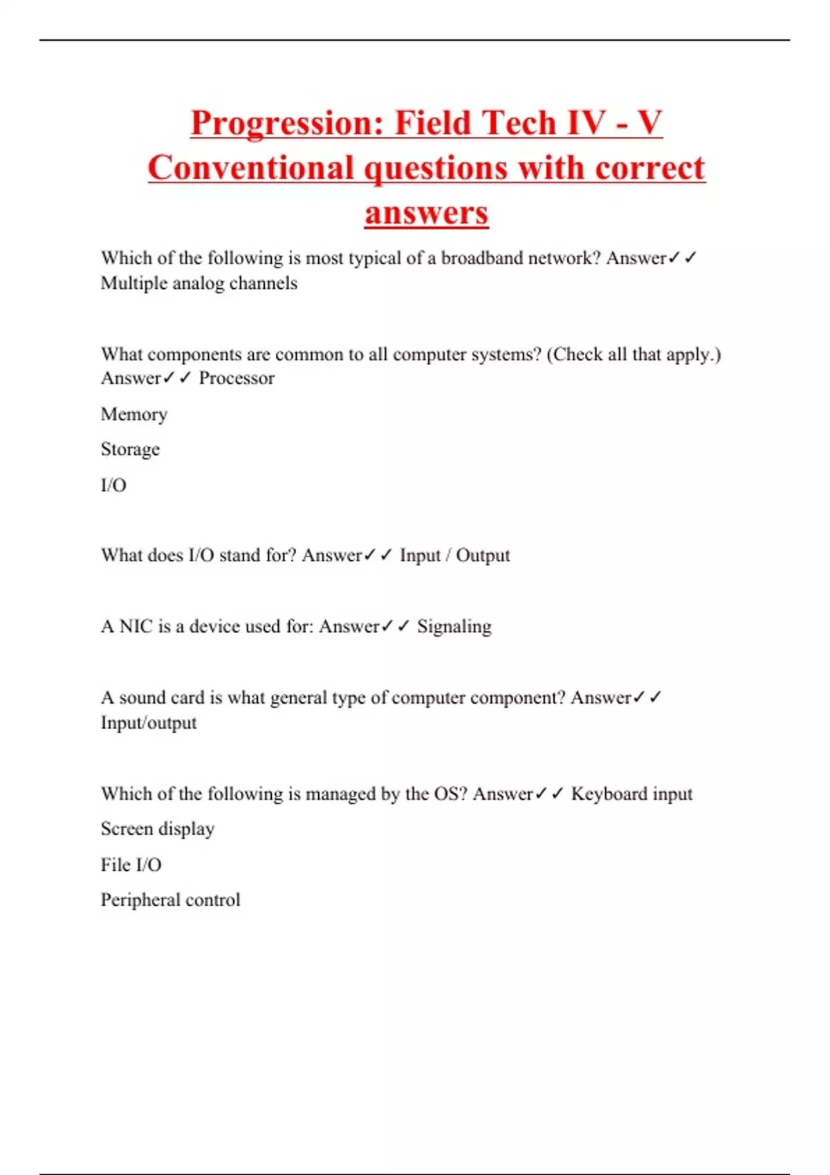 Which of the following is most typical of a broadband network? Answer Multiple analog channels What components are common to all computer systems? (Check all that apply.) Answer Processor Memory Storage I/O What does I/O stand for? Answer Input / Output A NIC is a device used for: Answer Signaling A sound card is what general type of computer component? Answer Input/output Which of the following is managed by the OS? Answer Keyboard input Screen display File I/O Peripheral control The primary purpose of a device driver