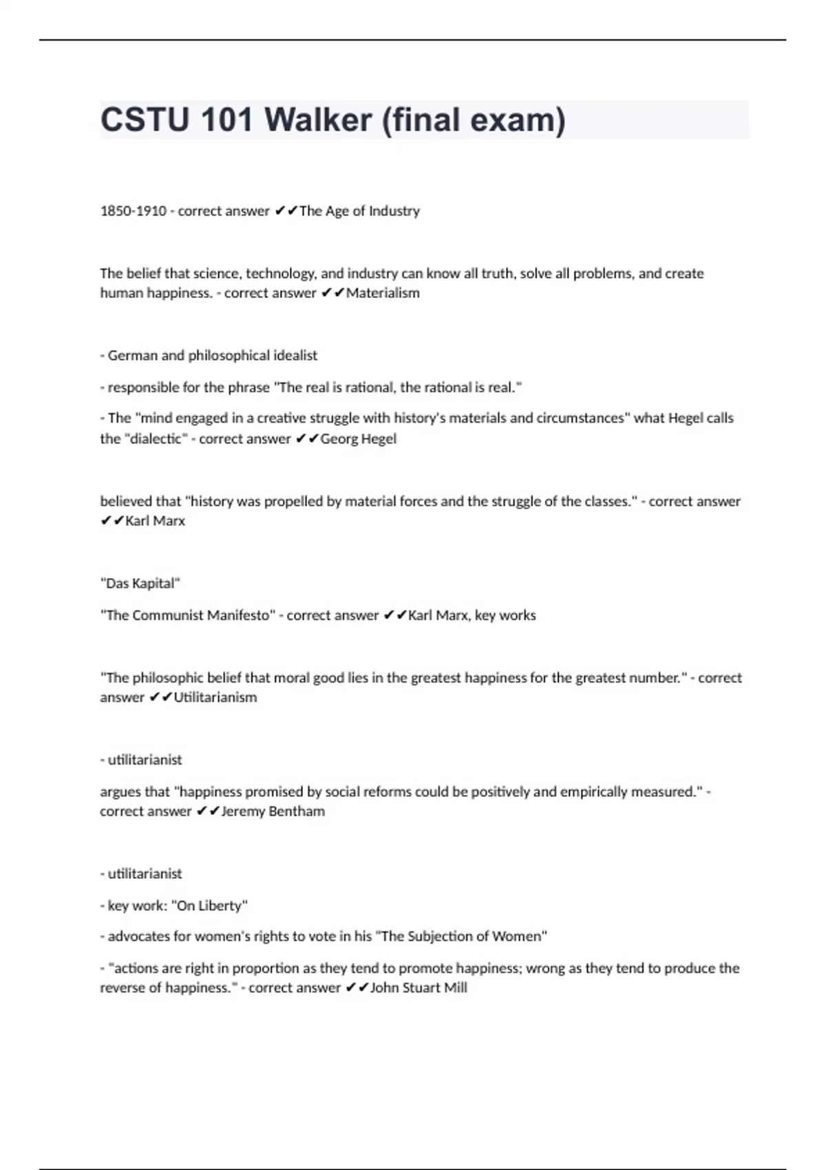 CSTU 101 Walker (final exam) - correct answer The Age of Industry The belief that science, technology, and industry can know all truth, solve all problems, and create human happiness. - correct answer Materialism - German and philosophical idealist - responsible for the phrase "The real is rational, the rational is real." - The "mind engaged in a creative struggle with history's materials and circumstances" what Hegel calls the "dialectic" - correct answer Georg Hegel believed that "history was propelled by material forces and the struggle of the classes." - correct answer Karl Marx "Das Kapital" "The Communist Manifesto" - correct answer Karl Marx, key works "The philosophic belief that moral good lies in the greatest happiness for the greatest number." - correct answer Utilitarianism - utilitarianist argues that "happiness promised by social reforms could be positively and empirically measured." - correct answer Jeremy Bentham - utilitarianist - key work: "On Liberty" - advocates for women's rights to vote in his "The Subjection of Women"