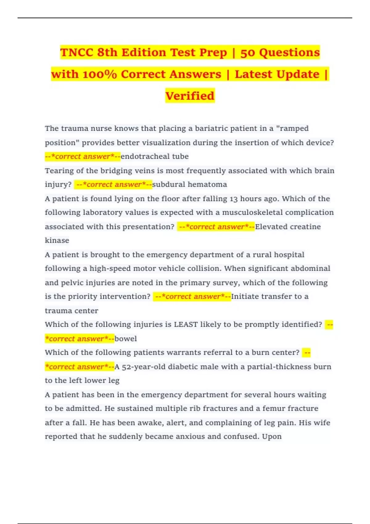 TNCC 8th Edition Test Prep | 50 Questions with 100% Correct Answers | Latest Update | Verified The trauma nurse knows that placing a bariatric patient in a "ramped position" provides better visualization during the insertion of which device? --*correct answer*--endotracheal tube Tearing of the bridging veins is most frequently associated with which brain injury? --*correct answer*--subdural hematoma A patient is found lying on the floor after falling 13 hours ago. Which of the following laboratory values is expected with a musculoskeletal complication associated with this presentation? --*correct answer*--Elevated creatine kinase