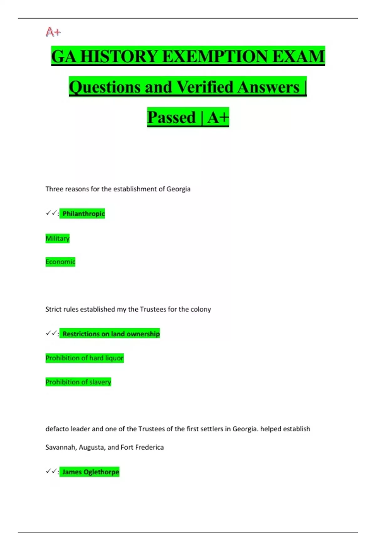 GA HISTORY EXEMPTION EXAM Questions and Verified Answers | Passed | A+