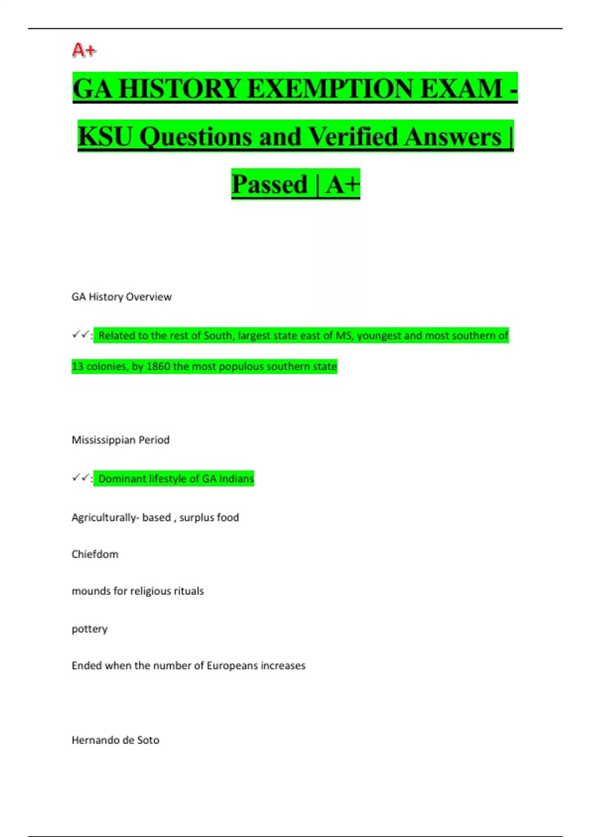 GA HISTORY EXEMPTION EXAM - KSU Questions and Verified Answers | Passed | A+