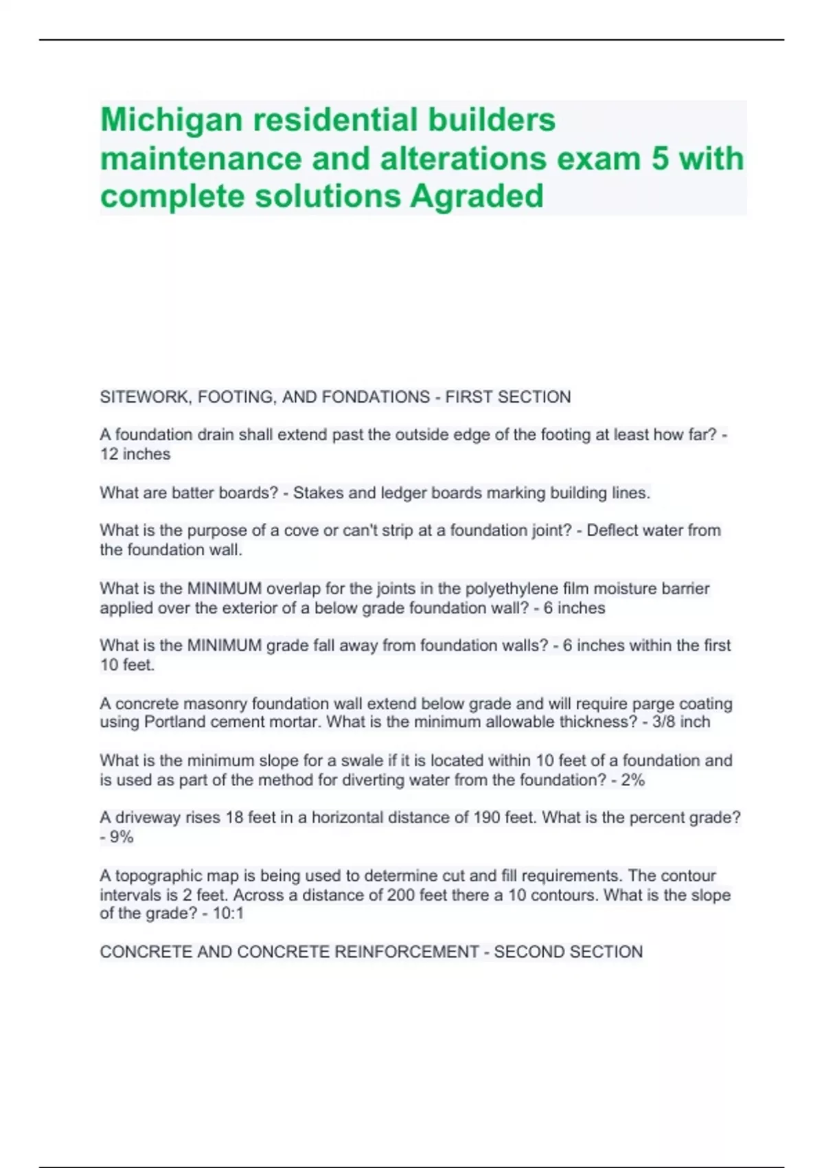 SITEWORK, FOOTING, AND FONDATIONS - FIRST SECTION A foundation drain shall extend past the outside edge of the footing at least how far? - 12 inches What are batter boards? - Stakes and ledger boards marking building lines. What is the purpose of a cove or can't strip at a foundation joint? - Deflect water from the foundation wall. What is the MINIMUM overlap for the joints in the polyethylene film moisture barrier applied over the exterior of a below grade foundation wall? - 6 inches What is the MINIMUM grade fall away from foundation walls? - 6 inches within the first 10 feet. A concrete masonry foundation wall extend below grade and will require parge coating using Portland cement mortar. What is the minimum allowable thickness? - 3/8 inch What is the minimum slope for a swale if it is located within 10 feet of a foundation and is used as part of the method for diverting water from the foundation? - 2% A driveway rises 18 feet in a horizontal distance of 190 feet. What is the percent grade? - 9% A topographic map is being used to determine cut and fill requirements. The contour intervals is 2 feet. Across a distance of 200 feet there a 10 contours. What is the slope of the grade? - 10:1 CONCRETE AND CONCRETE REINFORCEMENT - SECOND SECTION