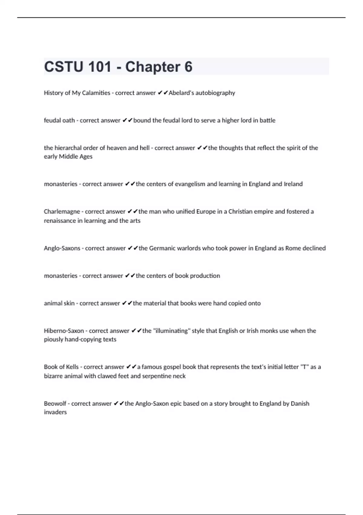 CSTU 101 - Chapter 6History of My Calamities - correct answer Abelard's autobiography feudal oath - correct answer bound the feudal lord to serve a higher lord in battle the hierarchal order of heaven and hell - correct answer the thoughts that reflect the spirit of the early Middle Ages monasteries - correct answer the centers of evangelism and learning in England and Ireland Charlemagne - correct answer the man who unified Europe in a Christian empire and fostered a renaissance in learning and the arts Anglo-Saxons - correct answer the Germanic warlords who took power in England as Rome declined monasteries - correct answer the centers of book production animal skin - correct answer the material that books were hand copied onto Hiberno-Saxon - correct answer the "illuminating" style that English or Irish monks use when the piously hand-copying texts Book of Kells - correct answer a famous gospel book that represents the text's initial letter "T" as a bizarre animal with clawed feet and serpentine neck