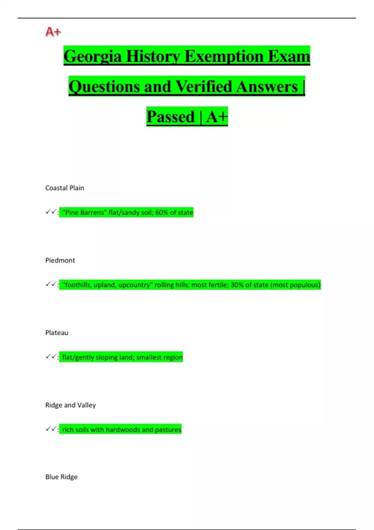 Georgia History Exemption Exam Questions and Verified Answers | Passed | A+