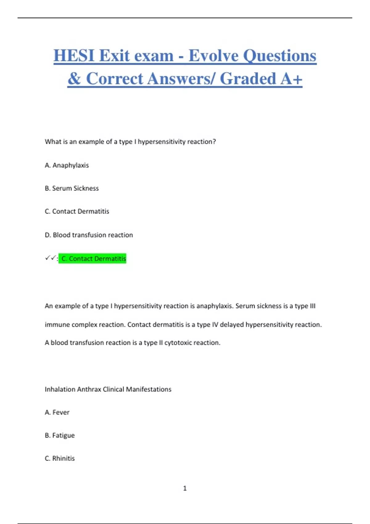 What is an example of a type I hypersensitivity reaction? A. Anaphylaxis B. Serum Sickness C. Contact Dermatitis D. Blood transfusion reaction : C. Contact Dermatitis An example of a type I hypersensitivity reaction is anaphylaxis. Serum sickness is a type III immune complex reaction. Contact dermatitis is a type IV delayed hypersensitivity reaction. A blood transfusion reaction is a type II cytotoxic reaction. Inhalation Anthrax Clinical Manifestations A. Fever B. Fatigue C. Rhinitis 2 D. Dry Cough E. Sore throat : Fever Fatigue Dry Cough Mild chest pain Which type of immunity will clients acquire through immunizations with live or killed vaccines? 1 Natural active immunity 2 Artificial active immunity 3 Natural passive immunity 4 Artificial passive immunity : 2 - Artificial active immunity is acquired through immunization with live or killed vaccines. Natural active immunity is acquired when there is natural contact with antigens 3 through a clinical infection. Natural passive immunity is acquired through the transfer of colostrums from mother to child. Artificial passive immunity is acquired by injecting serum from an immune human.