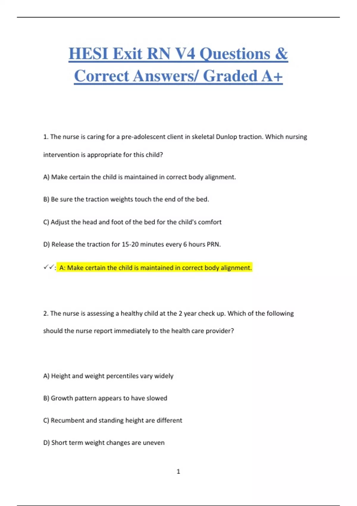 1. The nurse is caring for a pre-adolescent client in skeletal Dunlop traction. Which nursing intervention is appropriate for this child? A) Make certain the child is maintained in correct body alignment. B) Be sure the traction weights touch the end of the bed. C) Adjust the head and foot of the bed for the child's comfort D) Release the traction for 15-20 minutes every 6 hours PRN. : A: Make certain the child is maintained in correct body alignment. 2. The nurse is assessing a healthy child at the 2 year check up. Which of the following should the nurse report immediately to the health care provider? A) Height and weight percentiles vary widely B) Growth pattern appears to have slowed C) Recumbent and standing height are different D) Short term weight changes are uneven 2 : A: Height and weight percentiles vary widely 3. The parents of a 2 year-old child report that he has been holding his breath whenever he has temper tantrums. What is the best action by the nurse? A) Teach the parents how to perform cardiopulmonary resuscitation B) Recommend that the parents give in when he holds his breath to prevent anoxia C) Advise the parents to ignore breath holding because breathing will begin as a reflex D) Instruct the parents on how to reason with the child about possible harmful effects : C: Advise the parents to ignore breath holding because breathing will begin as a reflex 4. The nurse is assessing a client in the emergency room. Which statement suggests that the problem is acute angina? A) "My pain is deep in my chest behind my sternum." B) "When I sit up the pain gets worse." C) "As I take a deep breath the pain gets worse." D) "The pain is right here in my stomach area." : A: "My pain is deep in my chest behind my sternum." 3 5. The nurse is assessing the mental status of a client admitted with possible organic brain disorder. Which of these questions will best assess the function of the client's recent memory? A) "Name the year." "What season is this?" (pause for answer after each question) B) "Subtract 7 from 100 and then subtract 7 from that." (pause for answer) "Now continue to subtract 7 from the new number." C) "I am going to say the names of three things and I want you to repeat them after me: blue, ball, pen." D) "What is this on my wrist?" (point to your watch) Then ask, "What is the purpose of it?" : C: "I am going to say the names of three things and I want you to repeat them after me: blue, ball, pen."