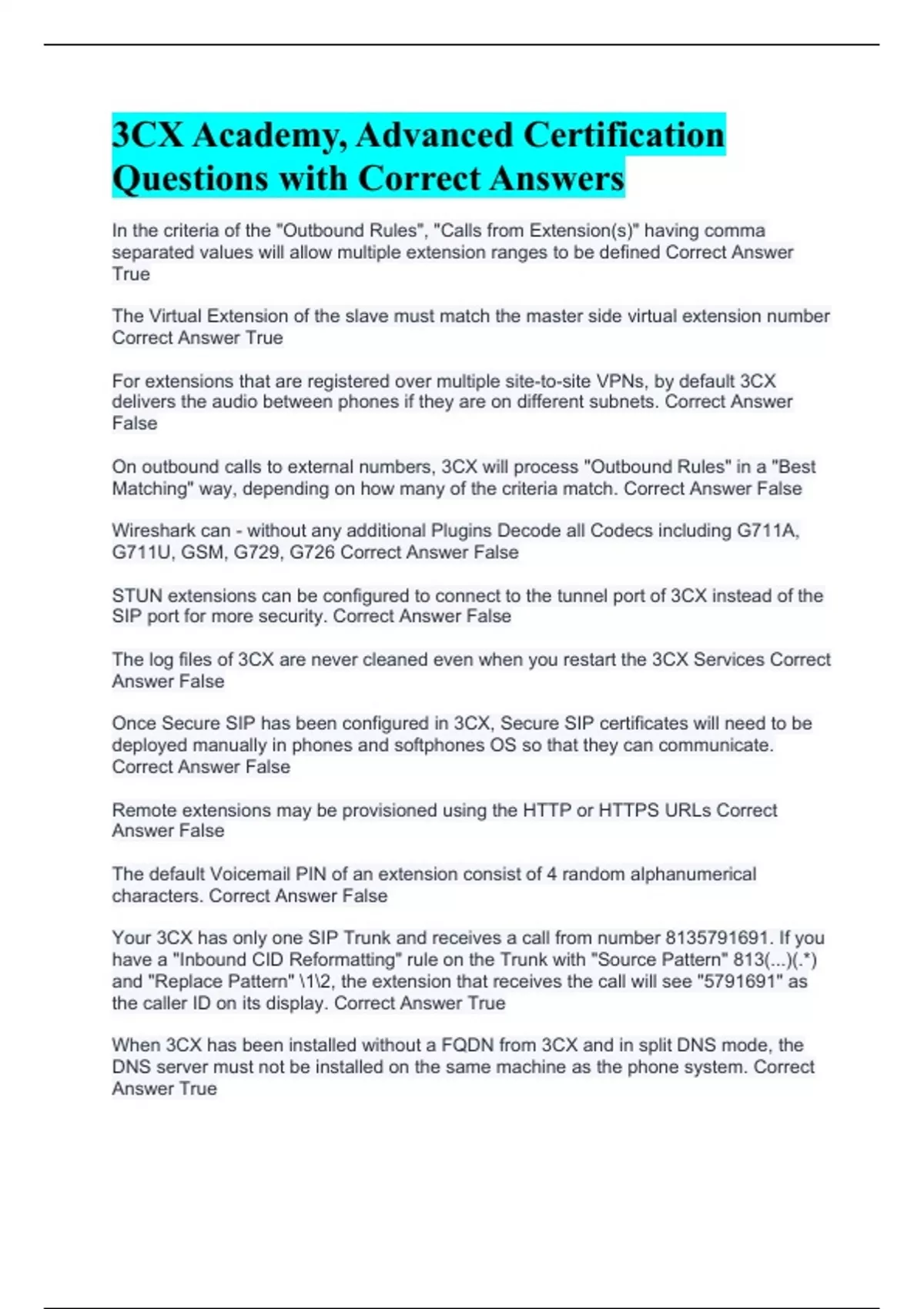 In the criteria of the "Outbound Rules", "Calls from Extension(s)" having comma separated values will allow multiple extension ranges to be defined Correct Answer True The Virtual Extension of the slave must match the master side virtual extension number Correct Answer True For extensions that are registered over multiple site-to-site VPNs, by default 3CX delivers the audio between phones if they are on different subnets. Correct Answer False On outbound calls to external numbers, 3CX will process "Outbound Rules" in a "Best Matching" way, depending on how many of the criteria match. Correct Answer False Wireshark can - without any additional Plugins Decode all Codecs including G711A, G711U, GSM, G729, G726 Correct Answer False STUN extensions can be configured to connect to the tunnel port of 3CX instead of the SIP port for more security. Correct Answer False The log files of 3CX are never cleaned even when you restart the 3CX Services Correct Answer False Once Secure SIP has been configured in 3CX, Secure SIP certificates will need to be deployed manually in phones and softphones OS so that they can communicate. Correct Answer False Remote extensions may be provisioned using the HTTP or HTTPS URLs Correct Answer False The default Voicemail PIN of an extension consist of 4 random alphanumerical characters. Correct Answer False Your 3CX has only one SIP Trunk and receives a call from number . If you have a "Inbound CID Reformatting" rule on the Trunk with "Source Pattern" 813(...)(.*) and "Replace Pattern" 12, the extension that receives the call will see "5791691" as the caller ID on its display. Correct Answer True When 3CX has been installed without a FQDN from 3CX and in split DNS mode, the DNS server must not be installed on the same machine as the phone system. Correct Answer True
