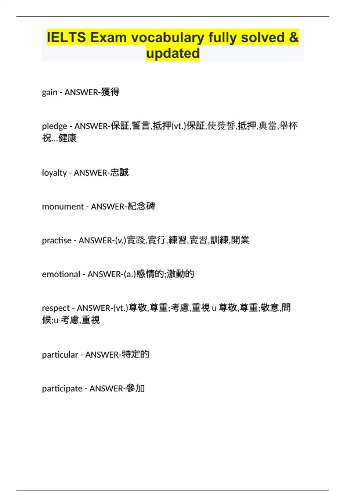 gain - ANSWER-獲得 pledge - ANSWER-保証,誓言,抵押(vt.)保証,使發誓,抵押,典當,舉杯祝...健康 loyalty - ANSWER-忠誠 monument - ANSWER-紀念碑 practise - ANSWER-(v.)實踐,實行,練習,實習,訓練,開業 emotional - ANSWER-(a.)感情的;激動的 respect - ANSWER-(vt.)尊敬,尊重;考慮,重視u尊敬,尊重;敬意,問候;u考慮,重視 particular - ANSWER-特定的 participate - ANSWER-參加