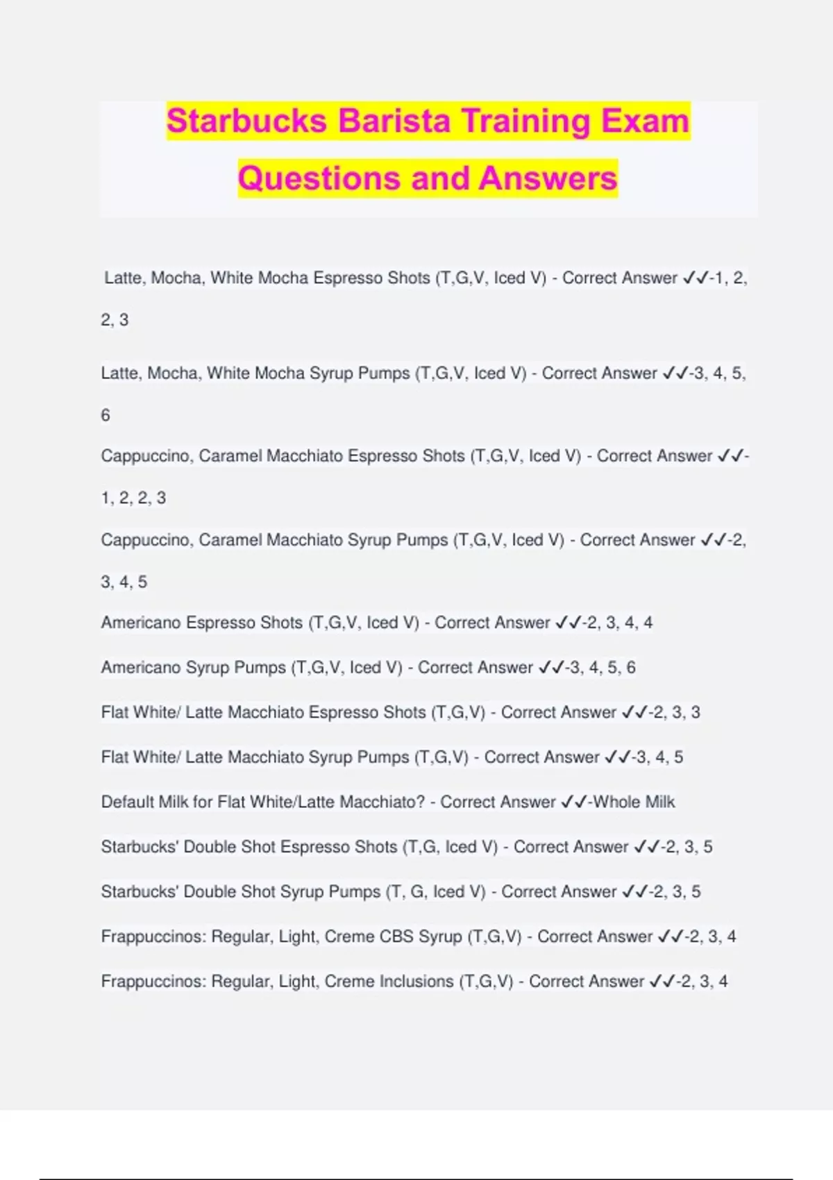 Starbucks Barista Training Exam Questions and Answers Latte, Mocha, White Mocha Espresso Shots (T,G,V, Iced V) - Correct Answer ️️ -1, 2, 2, 3 Latte, Mocha, White Mocha Syrup Pumps (T,G,V, Iced V) - Correct Answer ️️ -3, 4, 5, 6 Cappuccino, Caramel Macchiato Espresso Shots (T,G,V, Iced V) - Correct Answer ️️ - 1, 2, 2, 3 Cappuccino, Caramel Macchiato Syrup Pumps (T,G,V, Iced V) - Correct Answer ️️ -2, 3, 4, 5 Americano Espresso Shots (T,G,V, Iced V) - Correct Answer ️️ -2, 3, 4, 4 Americano Syrup Pumps (T,G,V, Iced V) - Correct Answer ️️ -3, 4, 5, 6 Flat White/ Latte Macchiato Espresso Shots (T,G,V) - Correct Answer ️️ -2, 3, 3 Flat White/ Latte Macchiato Syrup Pumps (T,G,V) - Correct Answer ️️ -3, 4, 5 Default Milk for Flat White/Latte Macchiato? - Correct Answer ️️ -Whole Milk Starbucks' Double Shot Espresso Shots (T,G, Iced V) - Correct Answer ️️ -2, 3, 5 Starbucks' Double Shot Syrup Pumps (T, G, Iced V) - Correct Answer ️️ -2, 3, 5 Frappuccinos: Regular, Light, Creme CBS Syrup (T,G,V) - Correct Answer ️️ -2, 3, 4 Frappuccinos: Regular, Light, Creme Inclusions (T,G,V) - Correct Answer ️️ -2, 3, 4 Frappuccinos: Regular, Light, Creme Espresso Bar Syrup (T,G,V) - Correct Answer ️️ -1, 2, 2 Refreshers: How many scoops for T,G,V? How many for Trenta? - Correct Answer ️️ - 1 for all sizes, except Trenta, which gets 2 Smoothies: What is the only size they come in? What are the ingredients? - Correct Answer ️️ -SS: 1 Banana, 2 protein scoops CS: 1 Banana, 2 protein scoops, 3 pumps of chocolate Vanilla - Correct Answer ️️ -V Caramel - Correct Answer ️️ -C Classic - Correct Answer ️️ -Cl Peach - Correct Answer ️️ -Pe Hazelnut - Correct Answer ️️ -H Mocha - Correct Answer ️️ -M Peppermint - Correct Answer ️️ -P