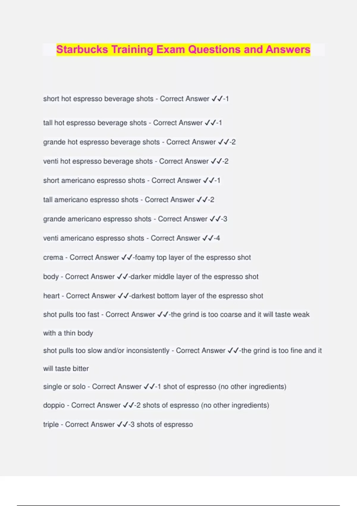 Starbucks Training Exam Questions and Answers short hot espresso beverage shots - Correct Answer ️️ -1 tall hot espresso beverage shots - Correct Answer ️️ -1 grande hot espresso beverage shots - Correct Answer ️️ -2 venti hot espresso beverage shots - Correct Answer ️️ -2 short americano espresso shots - Correct Answer ️️ -1 tall americano espresso shots - Correct Answer ️️ -2 grande americano espresso shots - Correct Answer ️️ -3 venti americano espresso shots - Correct Answer ️️ -4 crema - Correct Answer ️️ -foamy top layer of the espresso shot body - Correct Answer ️️ -darker middle layer of the espresso shot heart - Correct Answer ️️ -darkest bottom layer of the espresso shot shot pulls too fast - Correct Answer ️️ -the grind is too coarse and it will taste weak with a thin body shot pulls too slow and/or inconsistently - Correct Answer ️️ -the grind is too fine and it will taste bitter single or solo - Correct Answer ️️ -1 shot of espresso (no other ingredients) doppio - Correct Answer ️️ -2 shots of espresso (no other ingredients) triple - Correct Answer ️️ -3 shots of espresso quad - Correct Answer ️️ -4 shots of espresso tall iced espresso shots - Correct Answer ️️ -1 grande iced espresso shots - Correct Answer ️️ -2 venti iced espresso shots - Correct Answer ️️ -3 tall iced americano shots - Correct Answer ️️ -2 grande iced americano shots - Correct Answer ️️ -3 venti iced americano shots - Correct Answer ️️ -4 tall iced pumps - Correct Answer ️️ -3 grande iced pumps - Correct Answer ️️ -4 venti iced pumps - Correct Answer ️️ -6