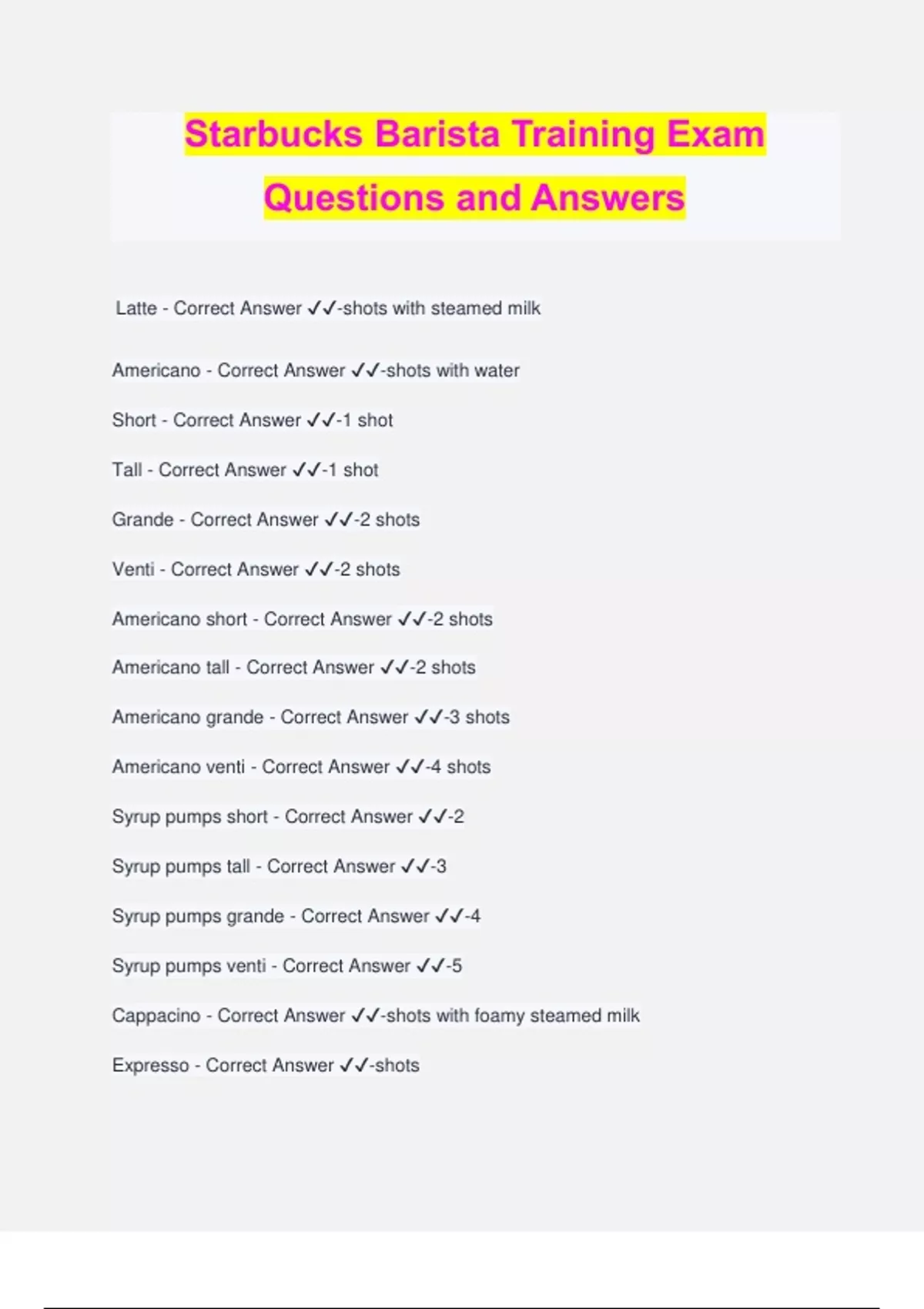 Starbucks Barista Training Exam Questions and Answers Latte - Correct Answer ️️ -shots with steamed milk Americano - Correct Answer ️️ -shots with water Short - Correct Answer ️️ -1 shot Tall - Correct Answer ️️ -1 shot Grande - Correct Answer ️️ -2 shots Venti - Correct Answer ️️ -2 shots Americano short - Correct Answer ️️ -2 shots Americano tall - Correct Answer ️️ -2 shots Americano grande - Correct Answer ️️ -3 shots Americano venti - Correct Answer ️️ -4 shots Syrup pumps short - Correct Answer ️️ -2 Syrup pumps tall - Correct Answer ️️ -3 Syrup pumps grande - Correct Answer ️️ -4 Syrup pumps venti - Correct Answer ️️ -5 Cappacino - Correct Answer ️️ -shots with foamy s