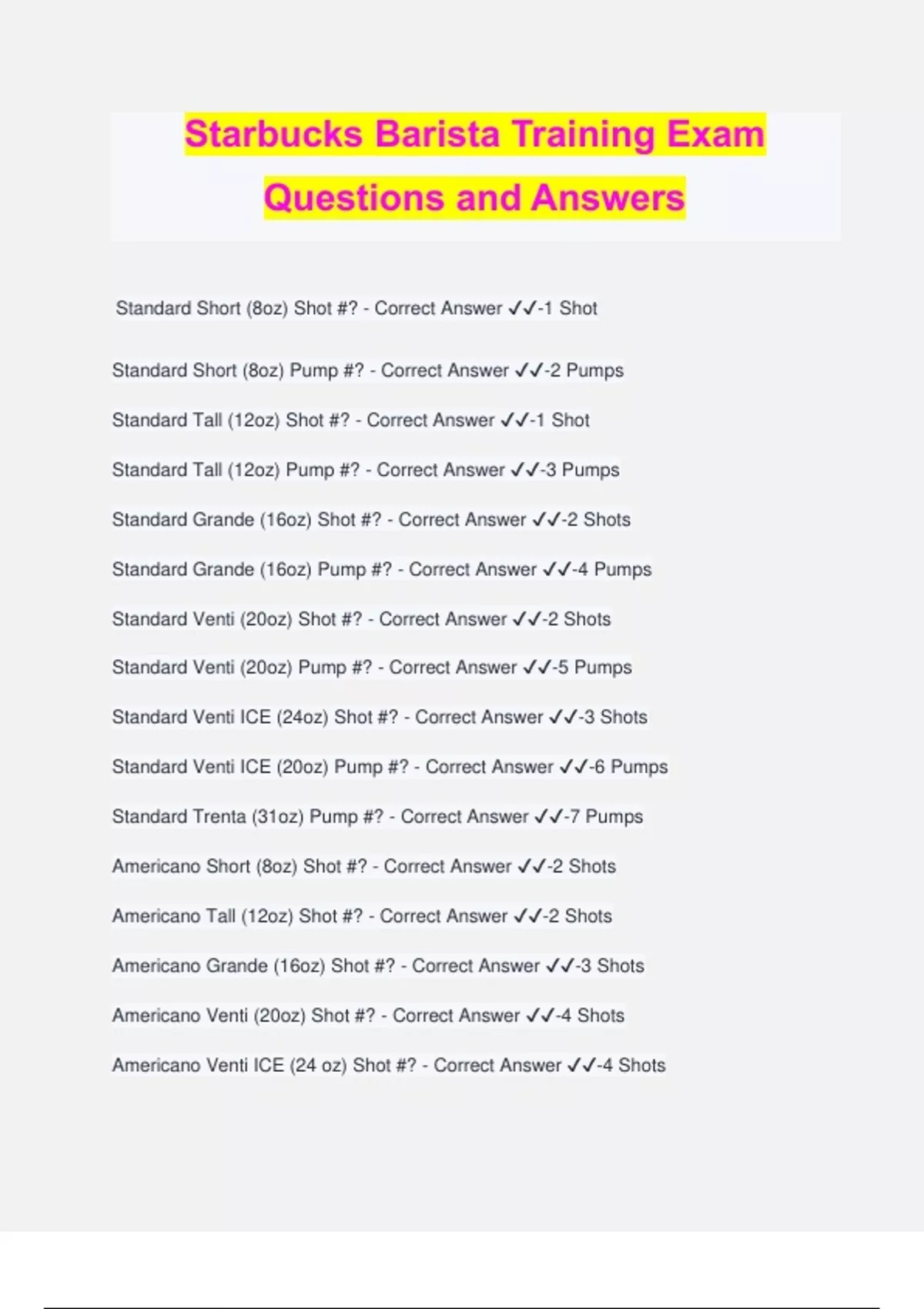 Starbucks Barista Training Exam Questions and Answers Standard Short (8oz) Shot #? - Correct Answer ️️ -1 Shot Standard Short (8oz) Pump #? - Correct Answer ️️ -2 Pumps Standard Tall (12oz) Shot #? - Correct Answer ️️ -1 Shot Standard Tall (12oz) Pump #? - Correct Answer ️️ -3 Pumps Standard Grande (16oz) Shot #? - Correct Answer ️️ -2 Shots Standard Grande (16oz) Pump #? - Correct Answer ️️ -4 Pumps Standard Venti (20oz) Shot #? - Correct Answer ️️ -2 Shots Standard Venti (20oz) Pump #? - Correct Answer ️️ -5 Pumps Standard Venti ICE (24oz) Shot #? - Correct Answer ️️ -3 Shots Standard Venti ICE (20oz) Pump #? - Correct Answer ️️ -6 Pumps Standard Trenta (31oz) Pump #? - Correct Answer ️️ -7 Pumps Americano Short (8oz) Shot #? - Correct Answer ️️ -2 Shots Americano Tall (12oz) Shot #? - Correct Answer ️️ -2 Shots Americano Grande (16oz) Shot #? - Correct Answer ️️ -3 Shots Americano Venti (20oz) Shot #? - Correct Answer ️️ -4 Shots Americano Venti ICE (24 oz) Shot #? - Correct Answer ️️ -4 Shots