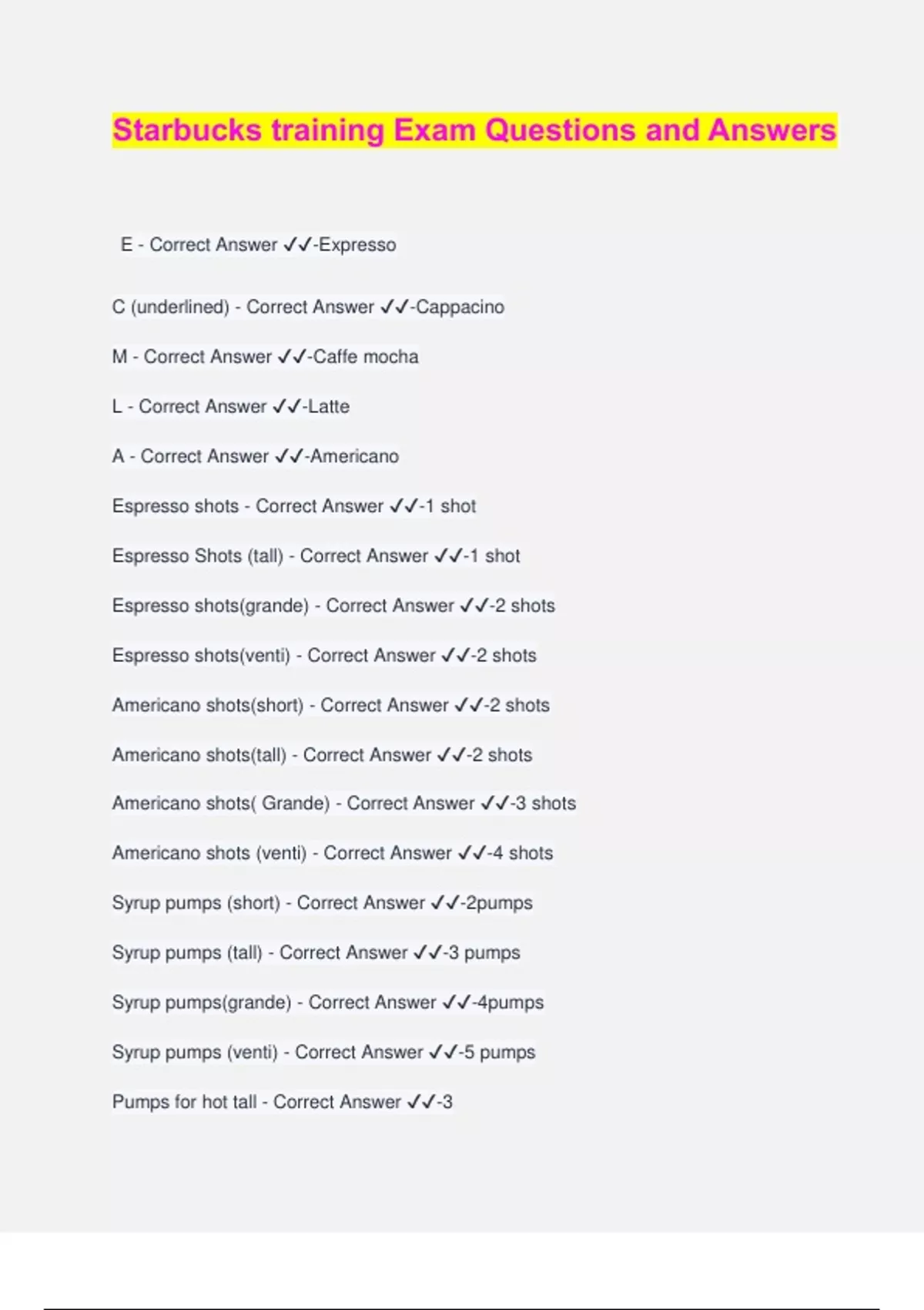 Starbucks training Exam Questions and Answers E - Correct Answer ️️ -Expresso C (underlined) - Correct Answer ️️ -Cappacino M - Correct Answer ️️ -Caffe mocha L - Correct Answer ️️ -Latte A - Correct Answer ️️ -Americano Espresso shots - Correct Answer ️️ -1 shot Espresso Shots (tall) - Correct Answer ️️ -1 shot Espresso shots(grande) - Correct Answer ️️ -2 shots Espresso shots(venti) - Correct Answer ️️ -2 shots