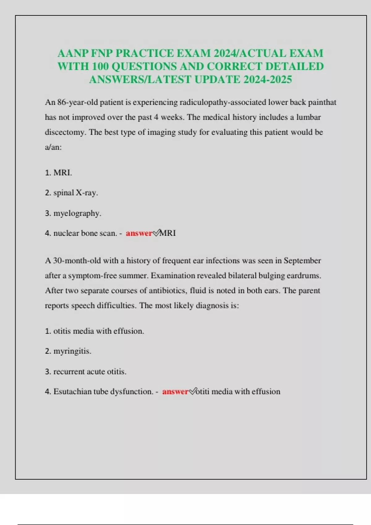 AANP FNP PRACTICE EXAM 2024/ACTUAL EXAM WITH 100 QUESTIONS AND CORRECT DETAILED ANSWERS/LATEST UPDATE
