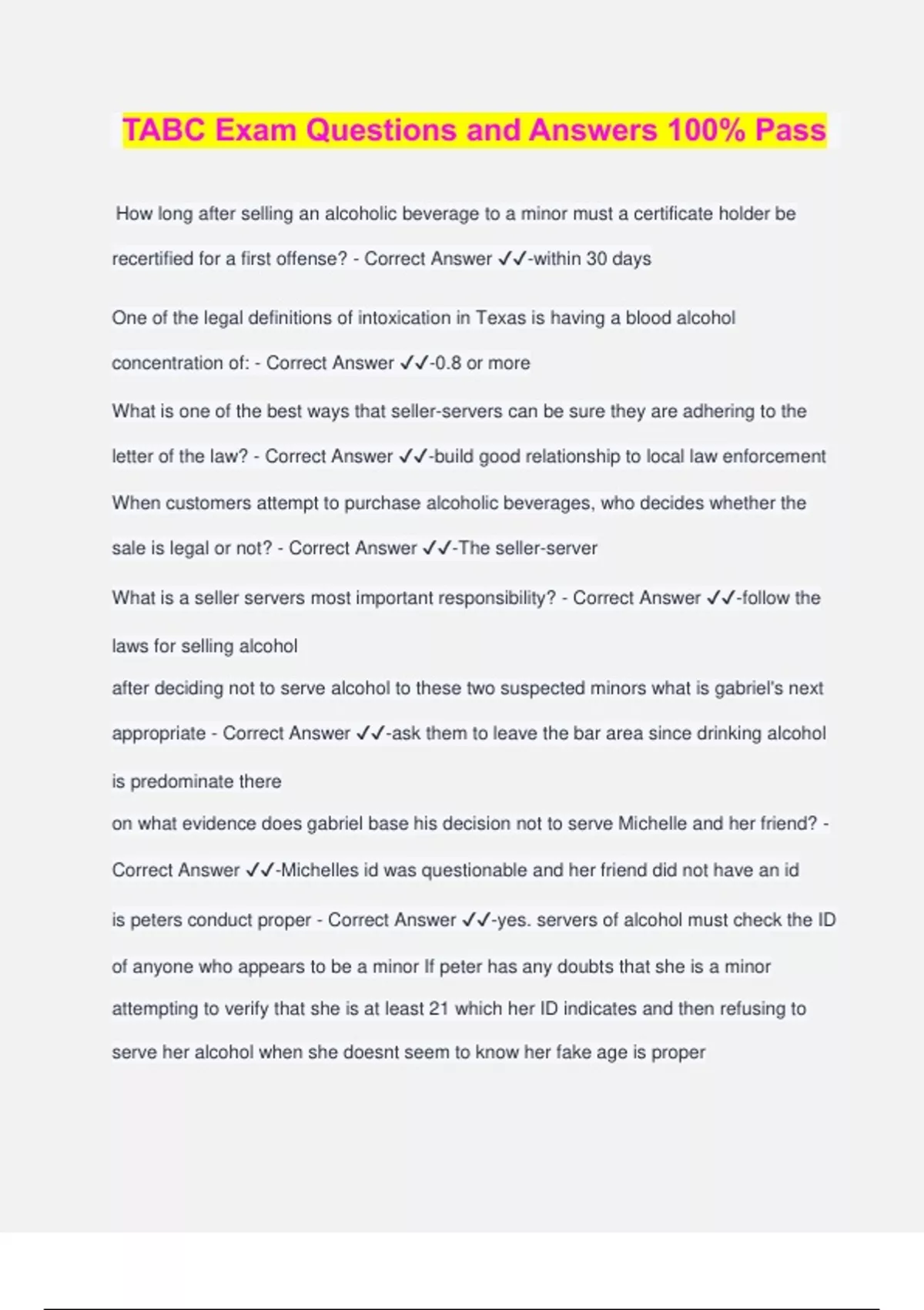 TABC Exam Questions and Answers 100% Pass How long after selling an alcoholic beverage to a minor must a certificate holder be recertified for a first offense? - Correct Answer ️️ -within 30 days One of the legal definitions of intoxication in Texas is having a blood alcohol concentration of: - Correct Answer ️️ -0.8 or more What is one of the best ways that seller-servers can be sure they are adhering to the letter of the law? - Correct Answer ️️ -build good relationship to local law enforcement When customers attempt to purchase alcoholic beverages, who decides whether the sale is legal or not? - Correct Answer ️️ -The seller-server What is a seller servers most important responsibility? - Correct Answer ️️ -follow the laws for selling alcohol after deciding not to serve alcohol to these two suspected minors what is gabriel's next appropriate - Correct Answer ️️ -ask them to leave the bar area since drinking alcohol is predominate there on what evidence does gabriel base his decision not to serve Michelle and her friend? - Correct Answer ️️ -Michelles id was questionable and her friend did not have an id is peters conduct proper - Correct Answer ️️ -yes. servers of alcohol must check the ID of anyone who appears to be a minor If peter has any doubts that she is a minor attempting to verify that she is at least 21 which her ID indicates and then refusing to serve her alcohol when she doesnt seem to know her fake age is proper why does peter ask for claire's birth date in reverse order - Correct Answer ️️ -if the ID is fake.....asking for the year first breaks that order breaks the memory Which of the following things may indicate an ID has been altered? - Correct Answer ️️ -Bumps or air pockets on laminated IDs it is illegal for a minor to: - Correct Answer ️️ -falsely state that he is 21 years of age or older Which of the following actions is illegal - Correct Answer ️️ -a minor attempts to purchase an alcoholic beverage under which of the following circumstances would it be illegal for a minor to possess an alcoholic beverage - Correct Answer ️️ -When at a bar with friends over the age of 21 safest way to avoid a sale to minors - Correct Answer ️️ -check their id signs of intoxication john is showing - Correct Answer ️️ -his speech is slurred, moving slowly, paris tells him she cannot serve him more, his mood be