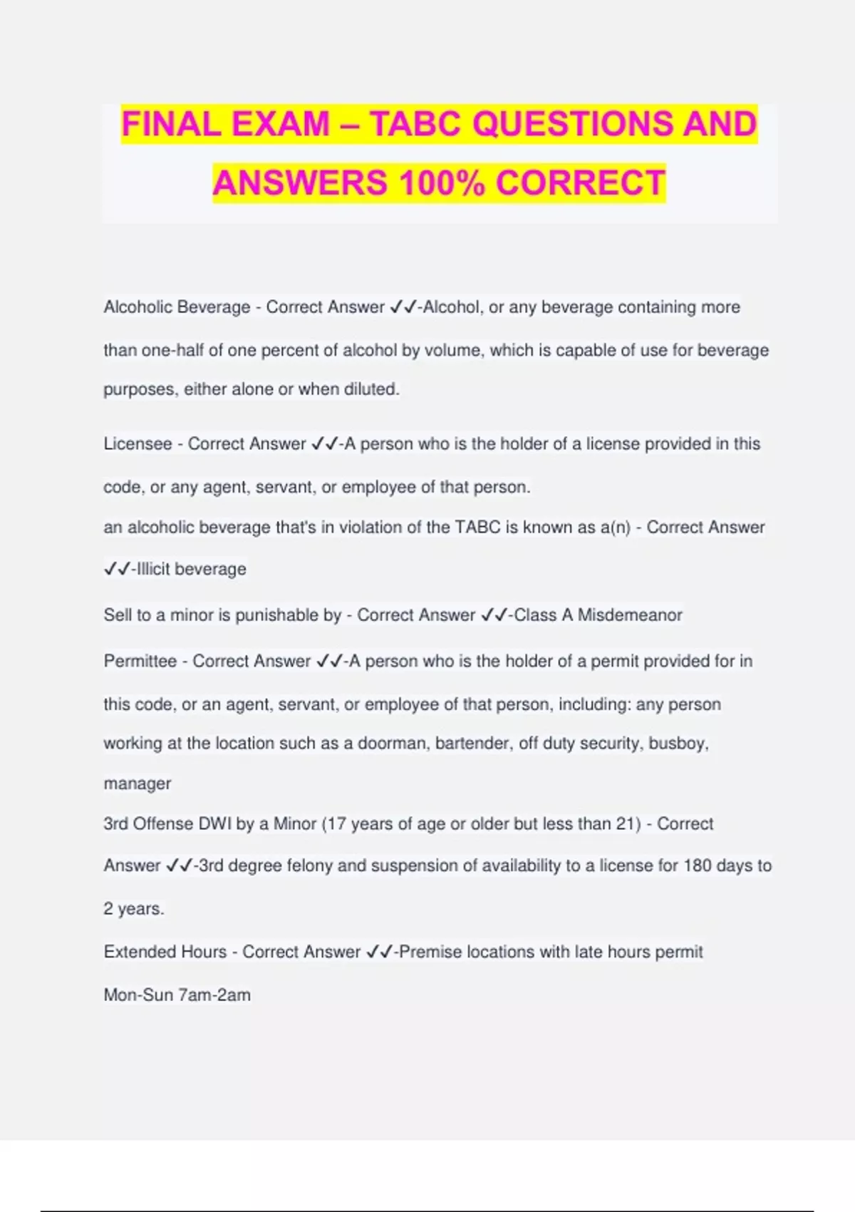 FINAL EXAM – TABC QUESTIONS AND ANSWERS 100% CORRECT Alcoholic Beverage - Correct Answer ️️ -Alcohol, or any beverage containing more than one-half of one percent of alcohol by volume, which is capable of use for beverage purposes, either alone or when diluted. Licensee - Correct Answer ️️ -A person who is the holder of a license provided in this code, or any agent, servant, or employee of that person. an alcoholic beverage that's in violation of the TABC is known as a(n) - Correct Answer ️️ -Illicit beverage Sell to a minor is punishable by - Correct Answer ️️ -Class A Misdemeanor Permittee - Correct Answer ️️ -A person who is the holder of a permit provided for in