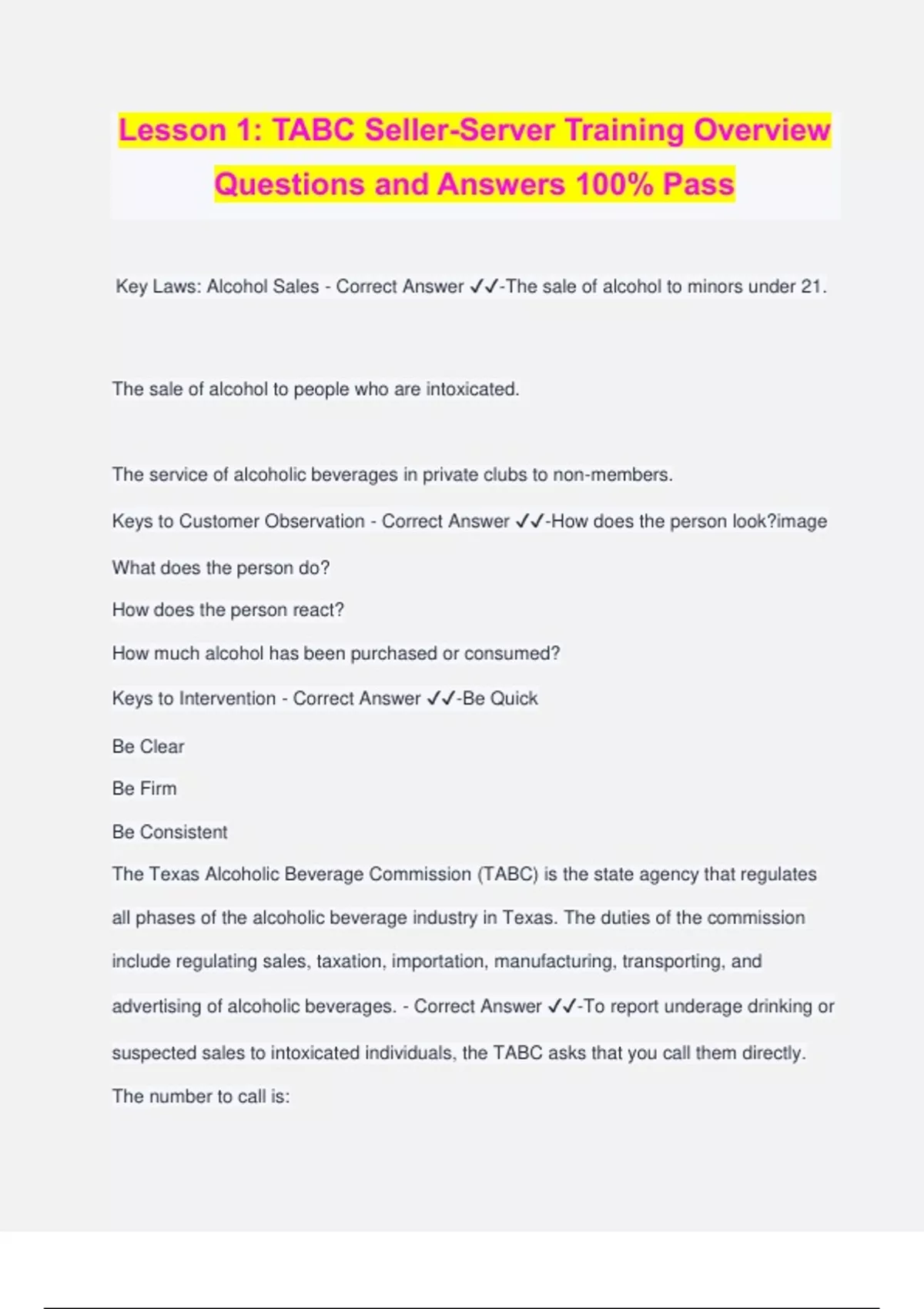 Lesson 1: TABC Seller-Server Training Overview Questions and Answers 100% Pass Key Laws: Alcohol Sales - Correct Answer ️️ -The sale of alcohol to minors under 21. The sale of alcohol to people who are intoxicated. The service of alcoholic beverages in private clubs to non-members. Keys to Customer Observation - Correct Answer ️️ -How does the person look?image What does the person do? How does the person react? How much alcohol has been purchased or consumed? Keys to Intervention - Correct Answer ️️ -Be Quick Be Clear Be Firm Be Consistent The Texas Alcoholic Beverage Commission (TABC) is the state agency that regulates all phases of the alcoholic beverage industry in Texas. The duties of the commission include regulating sales, taxation, importation, manufacturing, transporting, and advertising of alcoholic beverages. - Correct Answer ️️ -To report underage drinking or suspected sales to intoxicated individuals, the TABC asks that you call them directly. The number to call is: 1-888-THE-TABC () alcoholic beverage - Correct Answer ️️ -defined as alcohol, or any beverage containing more than one-half of one percent of alcohol by volume, which is capable of use for beverage purposes, either alone or when diluted. [Texas Alcoholic Beverage Code Sec. 1.04 (1)] on-premise - Correct Answer ️️ -consumption in establishments such as restaurants and bars off-premise - Correct Answer ️️ -are also sold in packages for off-premise consumption in establishments such as convenience stores, gas stations, grocery stores, or liquor stores. Examples of common alcoholic beverages are: - Correct Answer ️️ -Beer Malt liquor Wine Wine coolers Distilled spirits Mixed drinks Cocktails Employee - Correct Answer ️️ -anyone who sells, serves, dispenses, or delivers alcoholic beverages for a business that is licensed to sell alcohol is considered an employee of that business. This also includes anyone who immediately manages, directs, supervises, or controls the sale or service of alcoholic beverages. Minor - Correct Answer ️️ -For the purposes of alcoholic bever