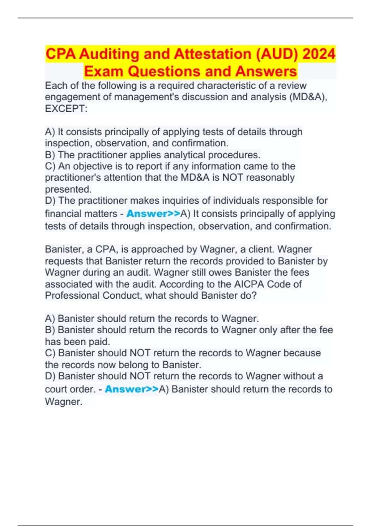 CPA Auditing and Attestation (AUD) 2024 Exam Questions and Answers
