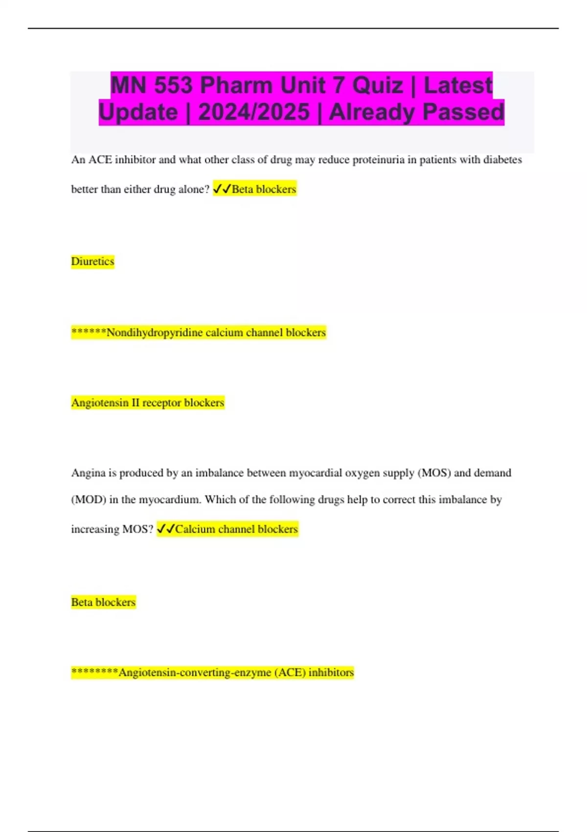 MN 553 Pharm Unit 7 Quiz | Latest Update | 2024/2025 | Already Passed An ACE inhibitor and what other class of drug may reduce proteinuria in patients with diabetes better than either drug alone? Beta blockers Diuretics ******Nondihydropyridine calcium channel blockers Angiotensin II receptor blockers Angina is produced by an imbalance between myocardial oxygen supply (MOS) and demand (MOD) in the myocardium. Which of the following drugs help to correct this imbalance by increasing MOS? Calcium channel blockers Beta blockers ********Angiotensin-converting-enzyme (ACE) inhibitors Aspirin Because of its action on various body systems, the patient taking a thiazide or loop diuretic may also need to receive the following supplement: *********Potassium Calcium Magnesium Phosphates Digoxin has a very limited role in treatment of heart failure. It is used mainly for patients with: Ejection fractions above 40% **An audible S3 Mitral stenosis as a primary cause for heart failure Renal insufficiency