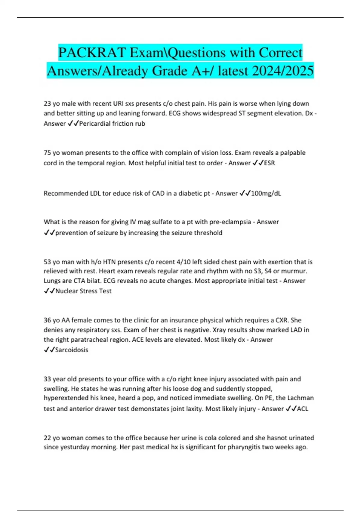 23 yo male with recent URI sxs presents c/o chest pain. His pain is worse when lying down and better sitting up and leaning forward. ECG shows widespread ST segment elevation. Dx - Answer Pericardial friction rub 75 yo woman presents to the office with complain of vision loss. Exam reveals a palpable cord in the temporal region. Most helpful initial test to order - Answer ESR Recommended LDL tor educe risk of CAD in a diabetic pt - Answer 100mg/dL What is the reason for giving IV mag sulfate to a pt with pre-eclampsia - Answer prevention of seizure by increasing the seizure threshold