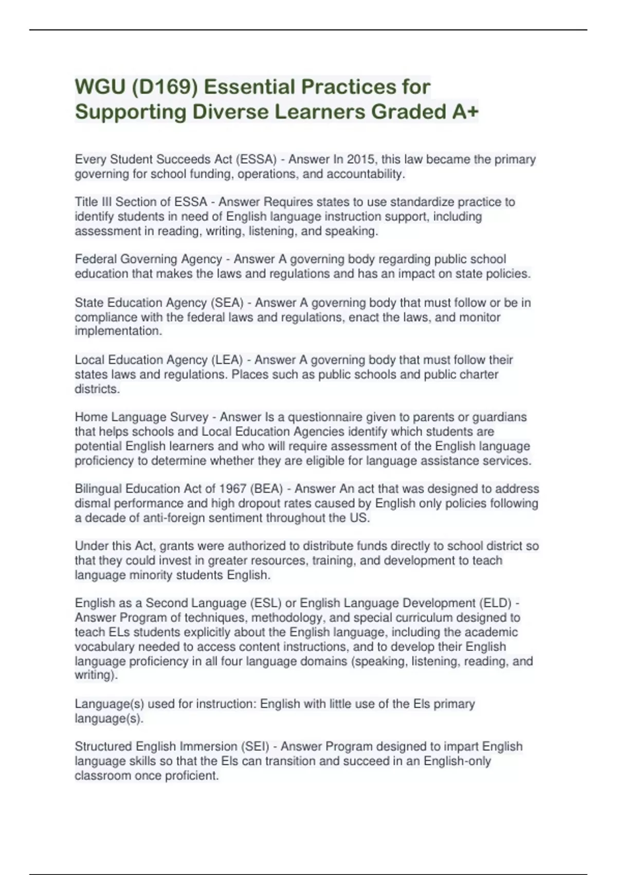 WGU (D169) Essential Practices for Supporting Diverse Learners Graded A+
