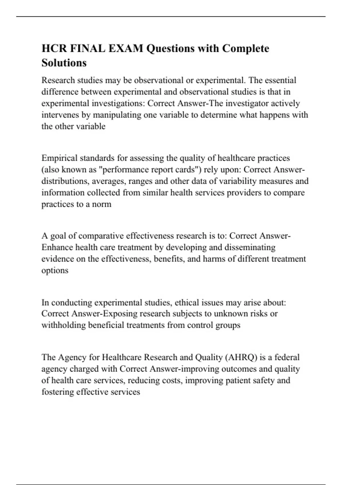 hcr final exam questions with complete solutions