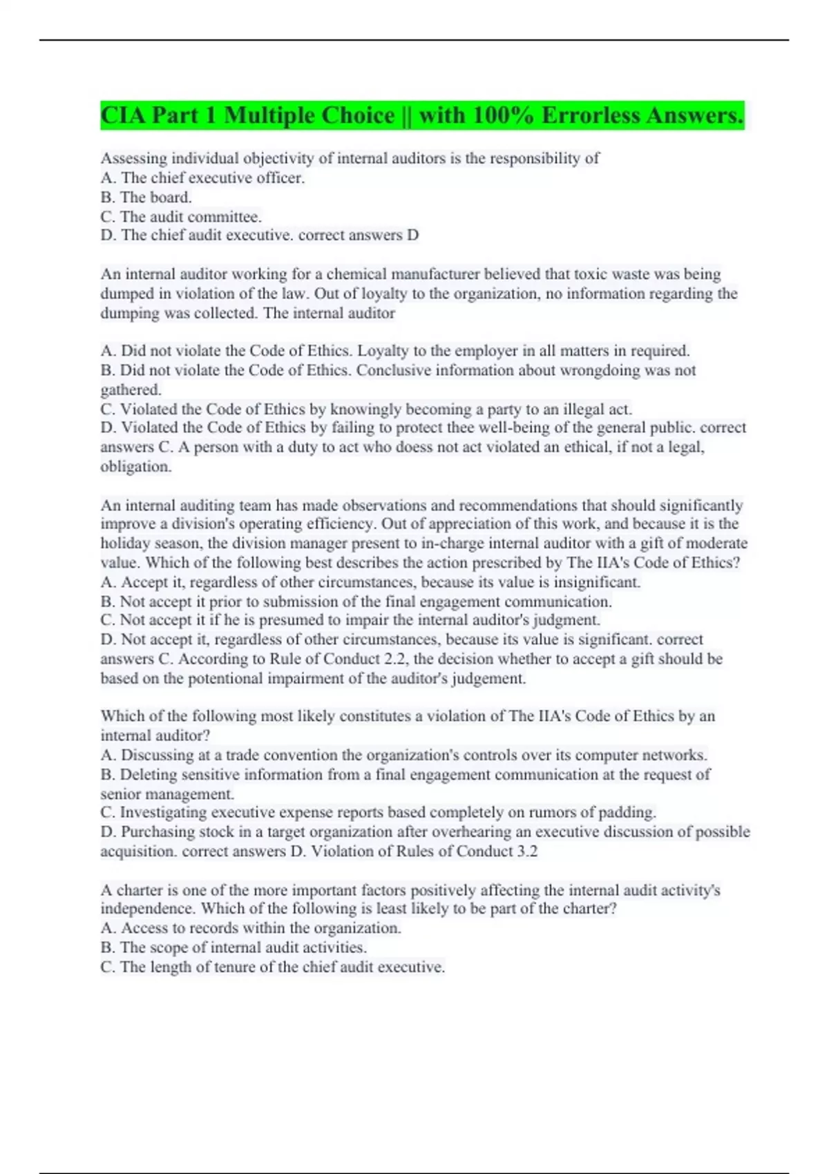 Assessing individual objectivity of internal auditors is the responsibility of A. The chief executive officer. B. The board. C. The audit committee. D. The chief audit executive. correct answers D An internal auditor working for a chemical manufacturer believed that toxic waste was being dumped in violation of the law. Out of loyalty to the organization, no information regarding the dumping was collected. The internal auditor A. Did not violate the Code of Ethics. Loyalty to the employer in all matters in required. B. Did not violate the Code of Ethics. Conclusive information about wrongdoing was not gathered. C. Violated the Code of Ethics by knowingly becoming a party to an illegal act. D. Violated the Code of Ethics by failing to protect thee well-being of the general public. correct answers C. A person with a duty to act who doess not act violated an ethical, if not a legal, obligation. An internal auditing team has made observations and recommendations that should significantly improve a division's operating efficiency. Out of appreciation of this work, and because it is the holiday season, the division manager present to in-charge internal auditor with a gift of moderate value. Which of the following best describes the action prescribed by The IIA's Code of Ethics? A. Accept it, regardless of other circumstances, because its value is insignificant. B. Not accept it prior to submission of the final engagement communication. C. Not accept it if he is presumed to impair the internal auditor's judgment. D. Not accept it, regardless of other circumstances, because its value is significant. correct answers C. According to Rule of Conduct 2.2, the decision whether to accept a gift should be based on the potentional impairment of the auditor's judgement. Which of the following most likely constitutes a violation of The IIA's Code of Ethics by an internal auditor? A. Discussing at a trade convention the organization's controls over its computer networks. B. Deleting sensitive information from a final engagement communication at the request of senior management. C. Investigating executive expense reports based completely on rumors of padding. D. Purchasing stock in a target organization after overhearing an executive discussion of possible acquisition. correct answers D. Violation of Rules of Conduct 3.2 A charter is one of the more important factors positively affecting the internal audit activity's independence. Which of the following is least likely to be part of the charter? A. Access to records within the organization. B. The scope of internal audit activities. C. The length of tenure of the chief audit executive.