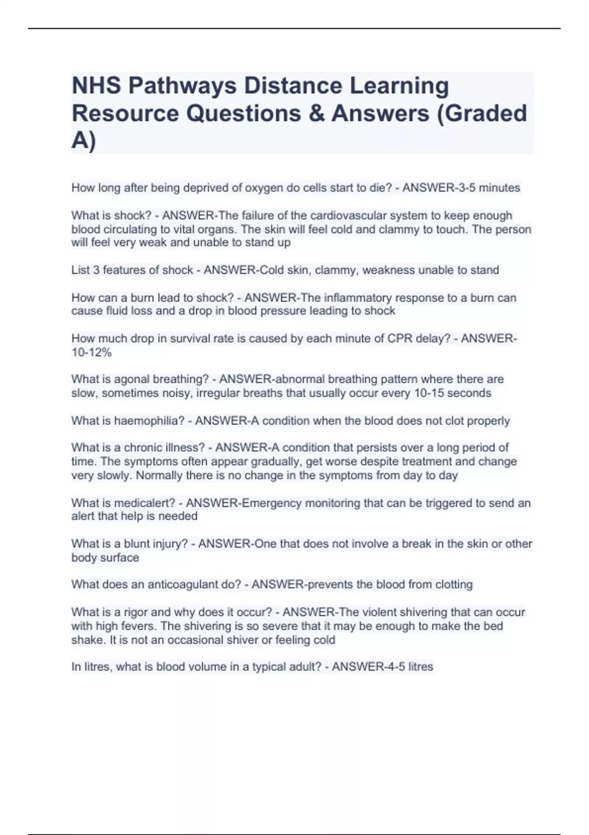 NHS Pathways Distance Learning Resource Questions & Answers (Graded A) NHS Pathways Distance Learning Resource Questions & Answers (Graded A) NHS Pathways Distance Learning Resource Questions & Answers (Graded A) NHS Pathways Distance Learning Resource Questions & Answers (Graded A) How long after being deprived of oxygen do cells start to die? - ANSWER-3-5 minutes What is shock? - ANSWER-The failure of the cardiovascular system to keep enough blood circulating to vital organs. The skin will feel cold and clammy to touch. The person will feel very weak and unable to stand up List 3 features of shock - ANSWER-Cold skin, clammy, weakness unable to stand