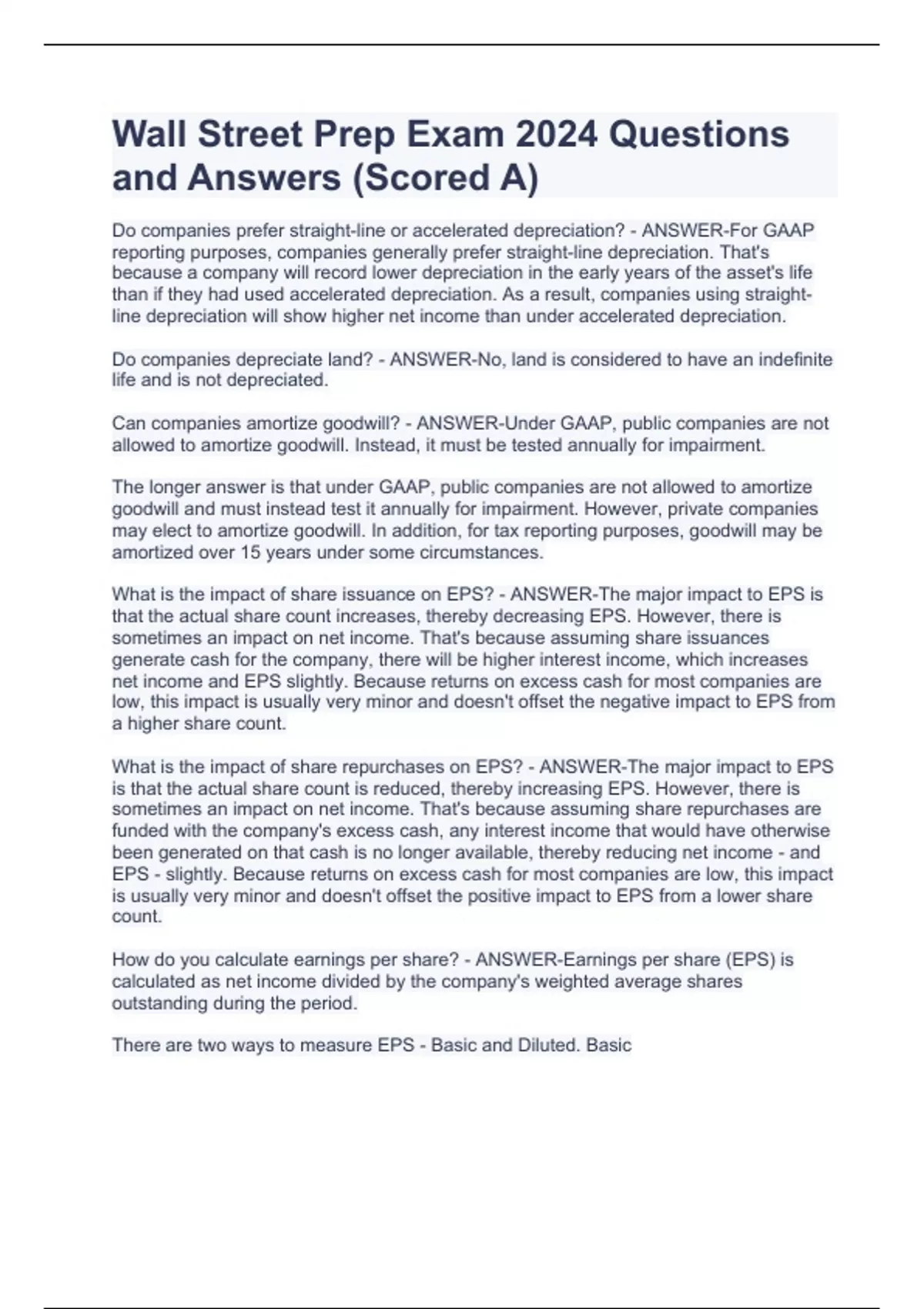 Wall Street Prep Exam 2024 Questions and Answers (Scored A) Wall Street Prep Exam 2024 Questions and Answers (Scored A) Wall Street Prep Exam 2024 Questions and Answers (Scored A) Wall Street Prep Exam 2024 Questions and Answers (Scored A) Do companies prefer straight-line or accelerated depreciation? - ANSWER-For GAAP reporting purposes, companies generally prefer straight-line depreciation. That's because a company will record lower depreciation in the early years of the asset's life than if they had used accelerated depreciation. As a result, companies using straight-line depreciation will show higher net income than under accelerated depreciation. Do companies depreciate land? - ANSWER-No, land is considered to have an indefinite life and is not depreciated. Can companies amortize goodwill? - ANSWER-Under GAAP, public companies are not allowed to amortize goodwill. Instead, it must be tested annually for impairment.