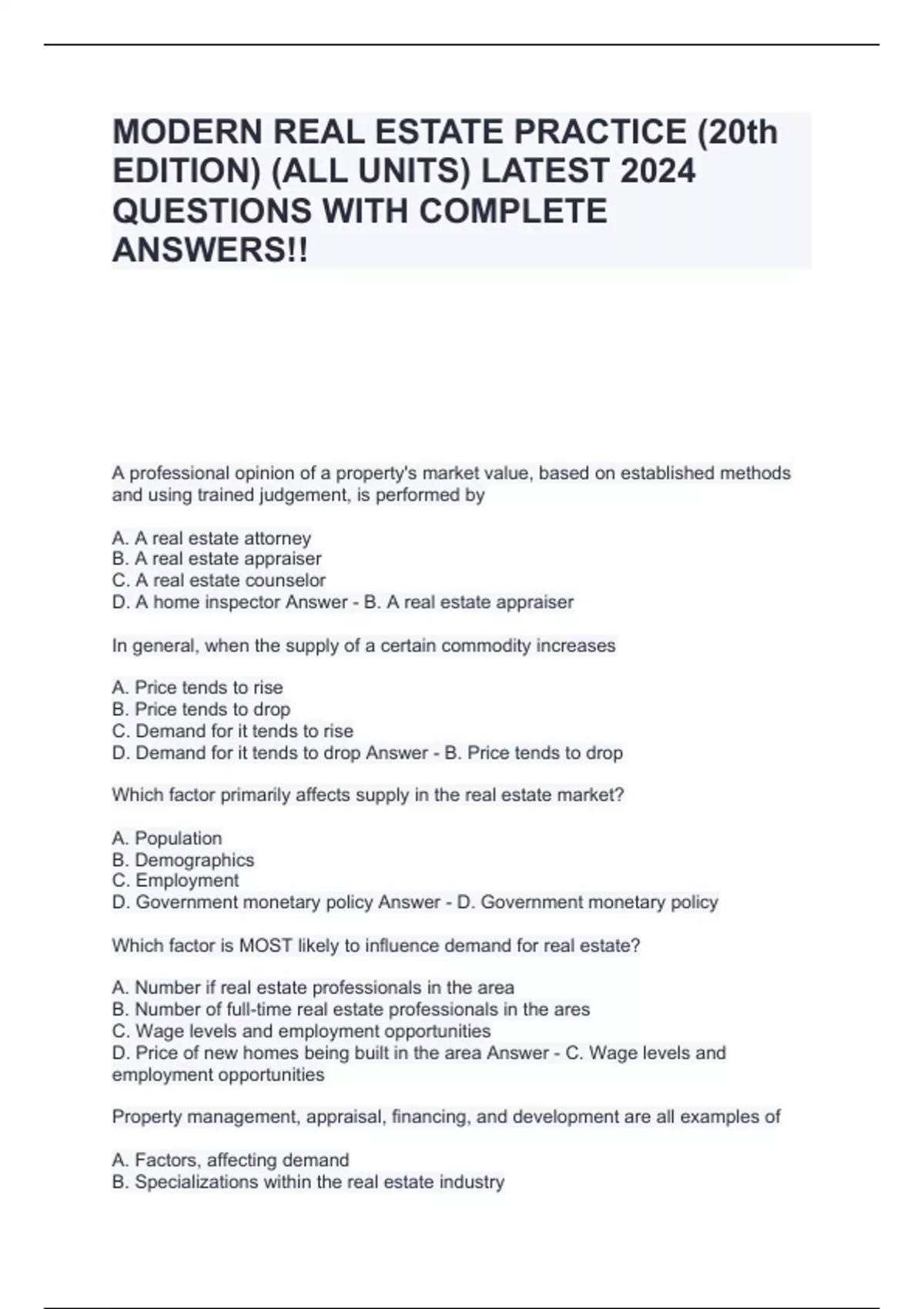 MODERN REAL ESTATE PRACTICE (20th EDITION) (ALL UNITS) LATEST 2024 QUESTIONS WITH COMPLETE ANSWERS!!