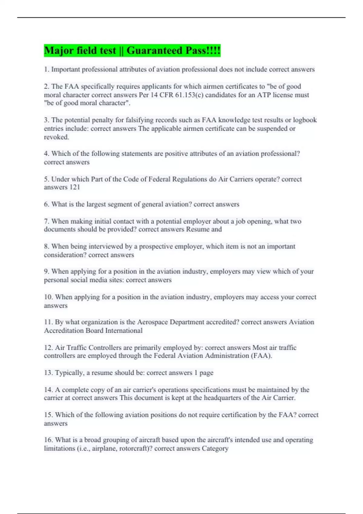 1. Important professional attributes of aviation professional does not include correct answers 2. The FAA specifically requires applicants for which airmen certificates to "be of good moral character correct answers Per 14 CFR 61.153(c) candidates for an ATP license must "be of good moral character". 3. The potential penalty for falsifying records such as FAA knowledge test results or logbook entries include: correct answers The applicable airmen certificate can be suspended or revoked. 4. Which of the following statements are positive attributes of an aviation professional? correct answers 5. Under which Part of the Code of Federal Regulations do Air Carriers operate? correct answers 121 6. What is the largest segment of general aviation? correct answers 7. When making initial contact with a potential employer about a job opening, what two documents should be provided? correct answers Resume and 8. When being interviewed by a prospective employer, which item is not an important consideration? correct answers 9. When applying for a position in the aviation industry, employers may view which of your personal social media sites: correct answers 10. When applying for a position in the aviation industry, employers may access your correct answers 11. By what organization is the Aerospace Department accredited? correct answers Aviation Accreditation Board International 12. Air Traffic Controllers are primarily employed by: correct answers Most air traffic controllers are employed through the Federal Aviation Administration (FAA). 13. Typically, a resume should be: correct answers 1 page 14. A complete copy of an air carrier's operations specifications must be maintained by the carrier at correct answers This document is kept at the headquarters of the Air Carrier. 15. Which of the following aviation positions do not require certification by the FAA? correct answers 16. What is a broad grouping of aircraft based upon the aircraft's intended use and operating limitations (i.e., airplane, rotorcraft)? correct answers Category