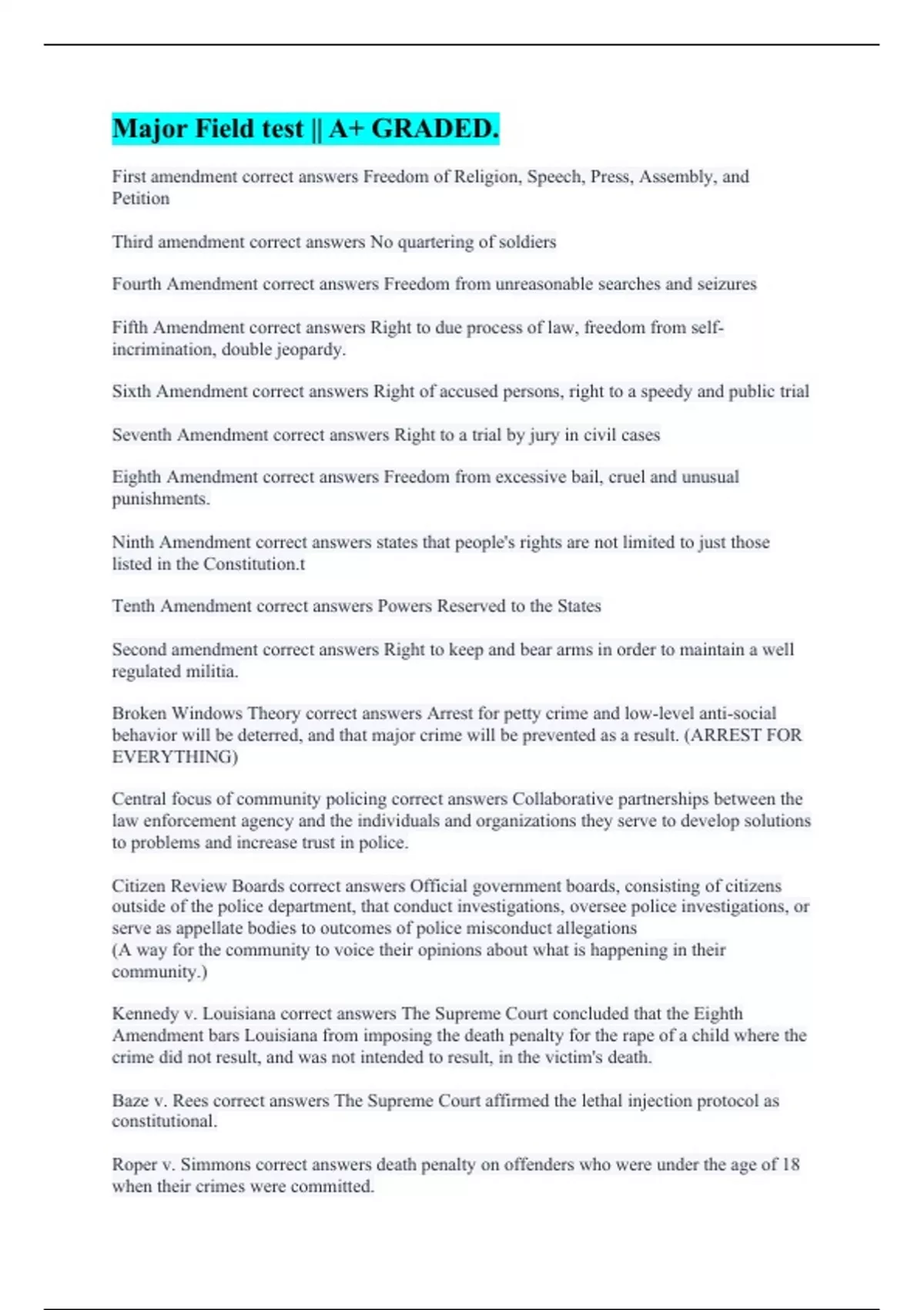 First amendment correct answers Freedom of Religion, Speech, Press, Assembly, and Petition Third amendment correct answers No quartering of soldiers Fourth Amendment correct answers Freedom from unreasonable searches and seizures Fifth Amendment correct answers Right to due process of law, freedom from self-incrimination, double jeopardy. Sixth Amendment correct answers Right of accused persons, right to a speedy and public trial Seventh Amendment correct answers Right to a trial by jury in civil cases Eighth Amendment correct answers Freedom from excessive bail, cruel and unusual punishments. Ninth Amendment correct answers states that people's rights are not limited to just those listed in the Constitution.t Tenth Amendment correct answers Powers Reserved to the States Second amendment correct answers Right to keep and bear arms in order to maintain a well regulated militia. Broken Windows Theory correct answers Arrest for petty crime and low-level anti-social behavior will be deterred, and that major crime will be prevented as a result. (ARREST FOR EVERYTHING) Central focus of community policing correct answers Collaborative partnerships between the law enforcement agency and the individuals and organizations they serve to develop solutions to problems and increase trust in police. Citizen Review Boards correct answers Official government boards, consisting of citizens outside of the police department, that conduct investigations, oversee police investigations, or serve as appellate bodies to outcomes of police misconduct allegations (A way for the community to voice their opinions about what is happening in their community.) Kennedy v. Louisiana correct answers The Supreme Court concluded that the Eighth Amendment bars Louisiana from imposing the death penalty for the rape of a child where the crime did not result, and was not intended to result, in the victim's death. Baze v. Rees correct answers The Supreme Court affirmed the lethal injection protocol as constitutional. Roper v. Simmons correct answers death penalty on offenders who were under the age of 18 when their crimes were committed.