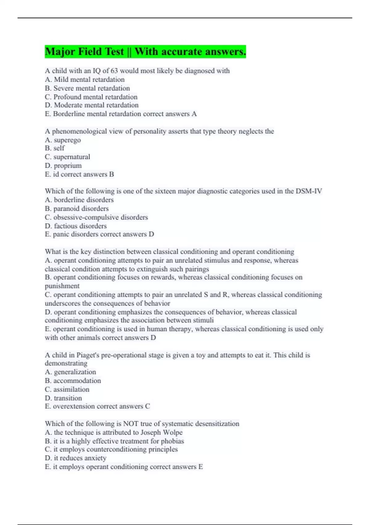 A child with an IQ of 63 would most likely be diagnosed with A. Mild mental retardation B. Severe mental retardation C. Profound mental retardation D. Moderate mental retardation E. Borderline mental retardation correct answers A A phenomenological view of personality asserts that type theory neglects the A. superego B. self C. supernatural D. proprium E. id correct answers B Which of the following is one of the sixteen major diagnostic categories used in the DSM-IV A. borderline disorders B. paranoid disorders C. obsessive-compulsive disorders D. factious disorders E. panic disorders correct answers D What is the key distinction between classical conditioning and operant conditioning A. operant conditioning attempts to pair an unrelated stimulus and response, whereas classical condition attempts to extinguish such pairings B. operant conditioning focuses on rewards, whereas classical conditioning focuses on punishment C. operant conditioning attempts to pair an unrelated S and R, whereas classical conditioning underscores the consequences of behavior D. operant conditioning emphasizes the consequences of behavior, whereas classical conditioning emphasizes the association between stimuli E. operant conditioning is used in human therapy, whereas classical conditioning is used only with other animals correct answers D A child in Piaget's pre-operational stage is given a toy and attempts to eat it. This child is demonstrating A. generalization B. accommodation C. assimilation D. transition E. overextension correct answers C Which of the following is NOT true of systematic desensitization A. the technique is attributed to Joseph Wolpe B. it is a highly effective treatment for phobias C. it employs counterconditioning principles D. it reduces anxiety E. it employs operant conditioning correct answers E