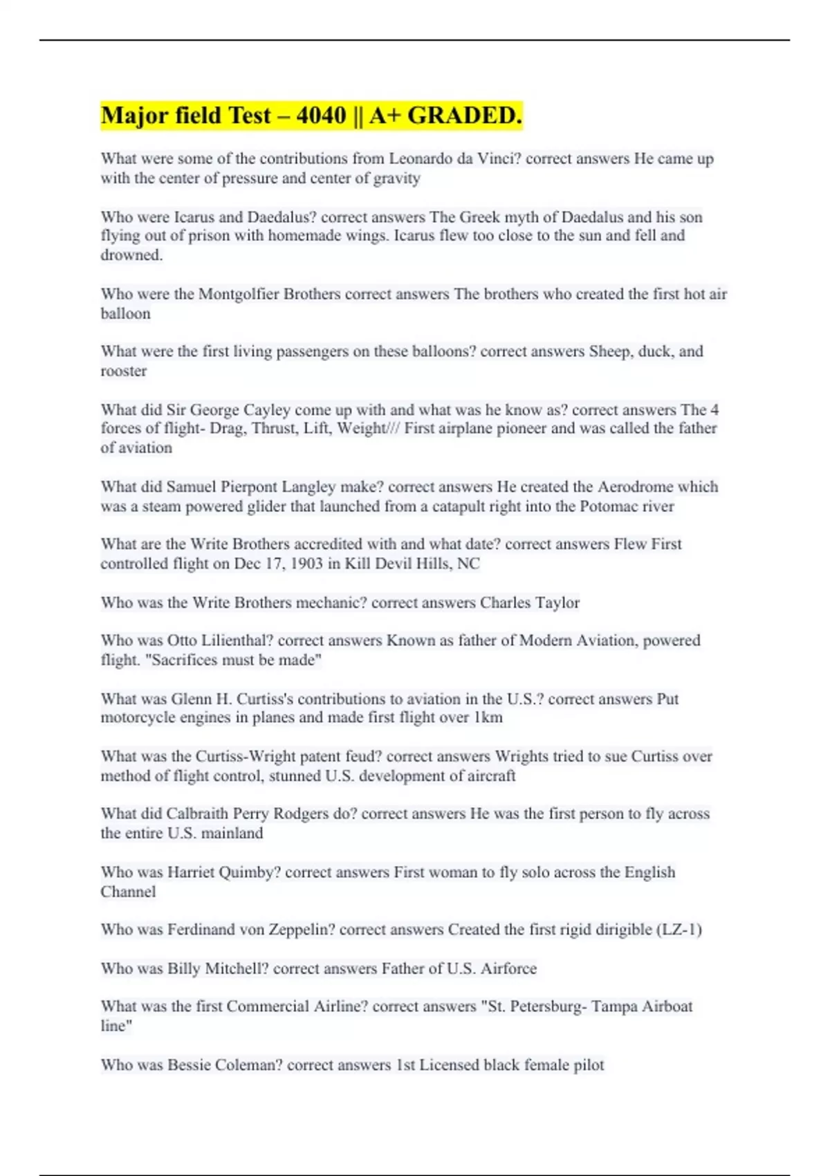 What were some of the contributions from Leonardo da Vinci? correct answers He came up with the center of pressure and center of gravity Who were Icarus and Daedalus? correct answers The Greek myth of Daedalus and his son flying out of prison with homemade wings. Icarus flew too close to the sun and fell and drowned. Who were the Montgolfier Brothers correct answers The brothers who created the first hot air balloon What were the first living passengers on these balloons? correct answers Sheep, duck, and rooster What did Sir George Cayley come up with and what was he know as? correct answers The 4 forces of flight- Drag, Thrust, Lift, Weight/// First airplane pioneer and was called the father of aviation What did Samuel Pierpont Langley make? correct answers He created the Aerodrome which was a steam powered glider that launched from a catapult right into the Potomac river What are the Write Brothers accredited with and what date? correct answers Flew First controlled flight on Dec 17, 1903 in Kill Devil Hills, NC Who was the Write Brothers mechanic? correct answers Charles Taylor Who was Otto Lilienthal? correct answers Known as father of Modern Aviation, powered flight. "Sacrifices must be made" What was Glenn H. Curtiss's contributions to aviation in the U.S.? correct answers Put motorcycle engines in planes and made first flight over 1km What was the Curtiss-Wright patent feud? correct answers Wrights tried to sue Curtiss over method of flight control, stunned U.S. development of aircraft What did Calbraith Perry Rodgers do? correct answers He was the first person to fly across the entire U.S. mainland Who was Harriet Quimby? correct answers First woman to fly solo across the English Channel Who was Ferdinand von Zeppelin? correct answers Created the first rigid dirigible (LZ-1) Who was Billy Mitchell? correct answers Father of U.S. Airforce What was the first Commercial Airline? correct answers "St. Petersburg- Tampa Airboat line" Who was Bessie Coleman? correct answers 1st Licensed black female pilot